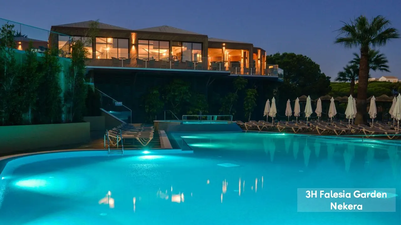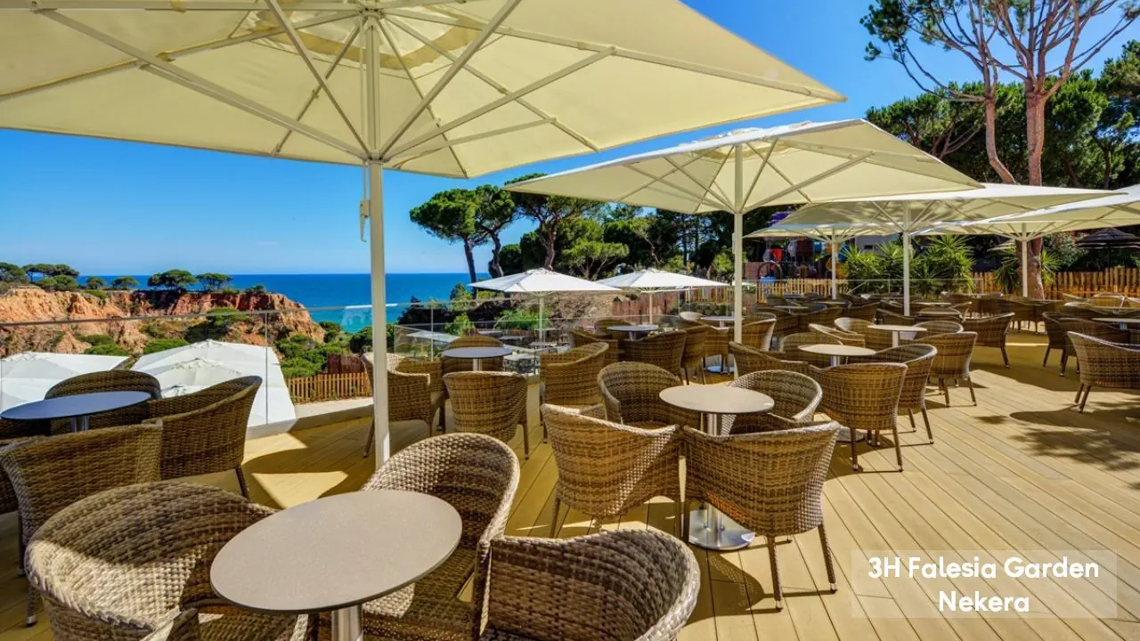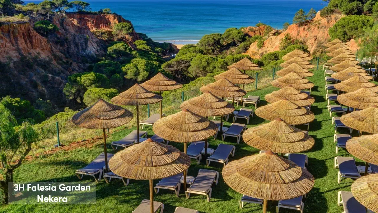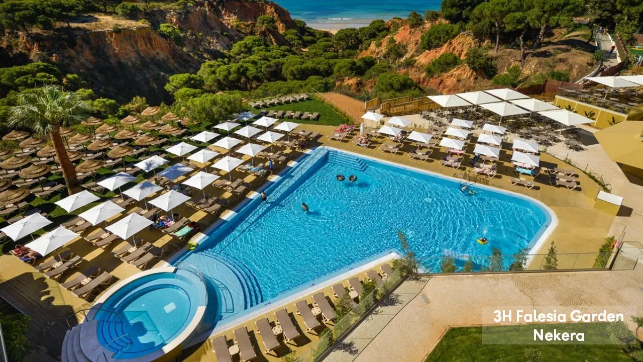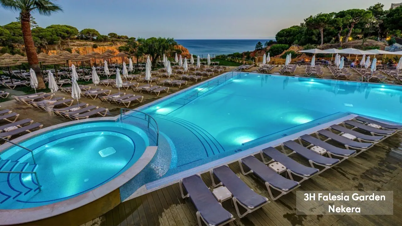 Położony na klifie hotel 3H Falésia Garden to imponujący kompleks z widokiem na ocean. Na miłośników słonecznych kąpieli czeka oddalona o ok 150 metrów plaża Praia do Barranco. Hotel dysponuje komfortowymi apartamentami z aneksem kuchennym. Obiekt idealny dla rodzin z dziećmi, gdzie czekają międzynarodowe animacje, plac zabaw oraz basen. Dorośli mogą zrelaksować się dzięki bogatemu programowi rozrywkowemu z muzyką na żywo. Odległość do lotniska w Faro to ok. 35 km a historycznego centrum Albufeiry to ok.7 km.