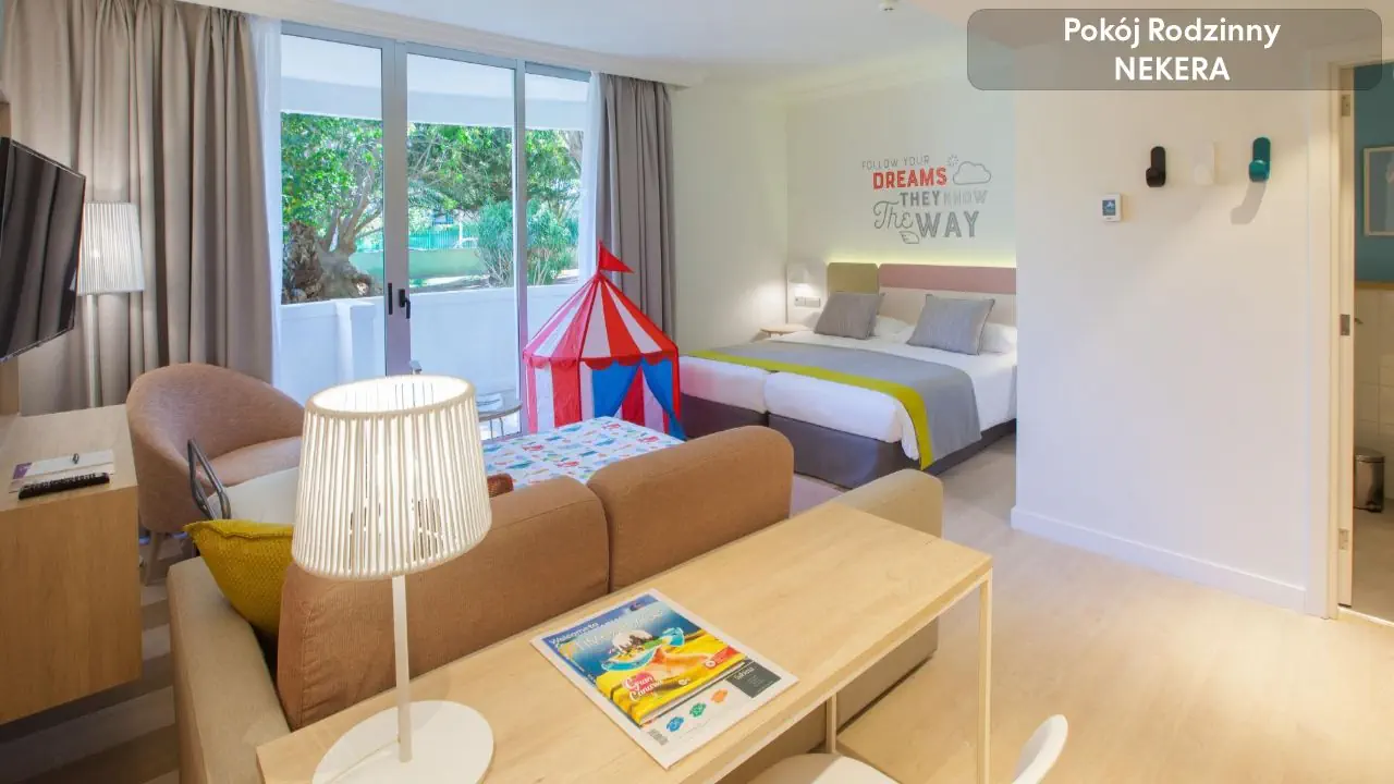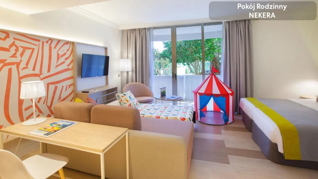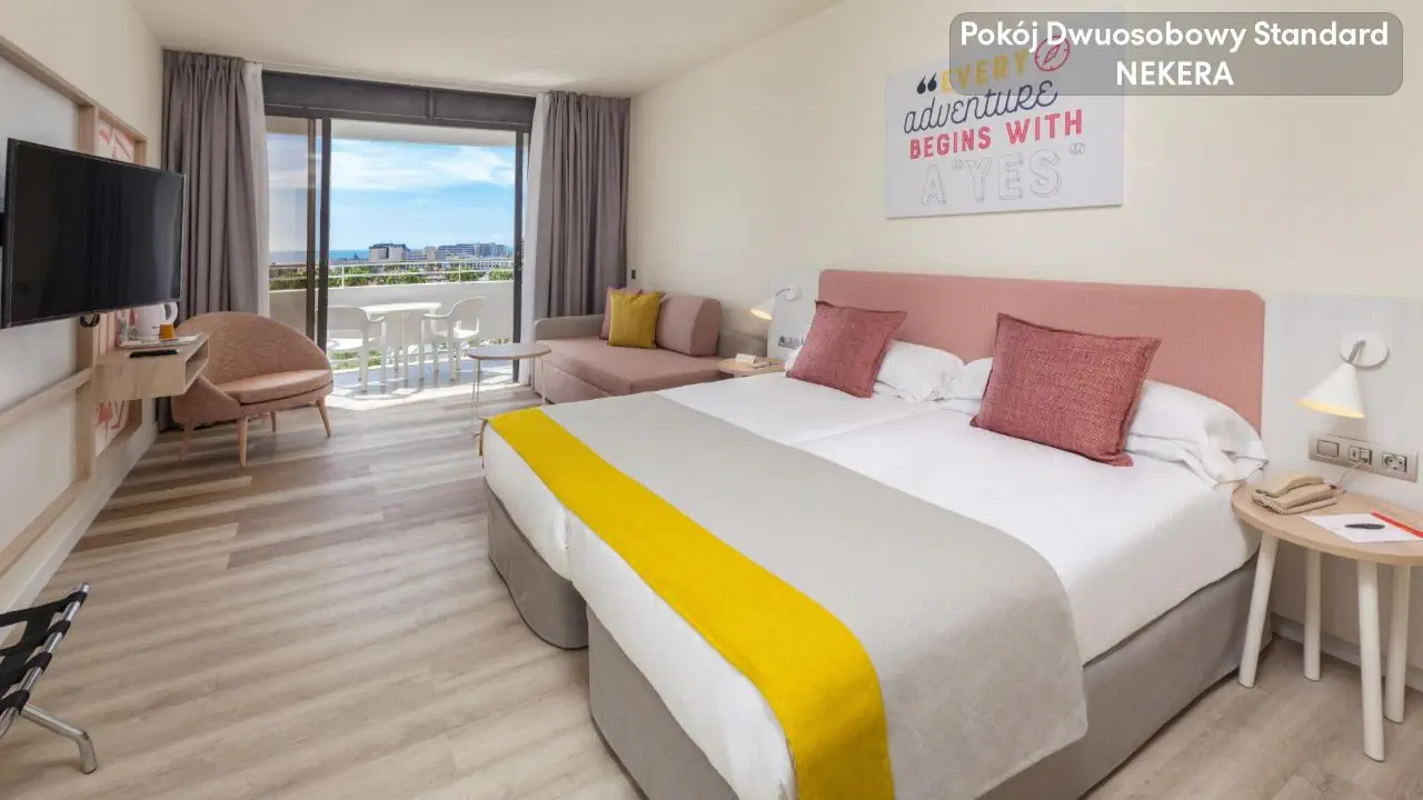 Pokój dwuosobowy - powierzchnia ok. 36 m2 - dla maksymalnie 1-2 osób - taras lub balkon - łazienka z prysznicem i suszarką do włosów - dwa łóżka pojedyncze lub jedno podwójne w zależności od dostępności - klimatyzacja - sejf - minibar za dodatkową opłatą - TV - prywatny taras lub balkon - czajnik - bezpłatne WiFi Pokój Rodzinny - powierzchnia ok. 36 m2 - dla 2-4 osób - taras lub balkon - łazienka z prysznicem i suszarką do włosów - dwa lóżka pojedyncze lub jedno podwójne w zależności od dostępności - klimatyzacja - sejf - minibar za dodatkową opłatą - TV - prywatny taras lub balkon - czajnik - bezpłatne WiFi Pokój Dwuosobowy Ekonomiczny - powierzchnia ok. 36 m2 - maksymalnie 2 osoby - balkon lub taras - łazienka z prysznicem - dwa pojedyncze łóżka lub jedno podwójne w zależności od dostępności - klimatyzacja - sejf - minibar za dodatkową opłatą - TV - prywatny taras lub balkon - czajnik - bezpłatne WiFi Pokój Deluxe - tylko dla osób powyżej 18 roku życia - dla maksymalnie 1 do 3 osób - dwa łóżka pojedyncze, lub jedno łóżko podwójne w zależności od dostępności - balkon lub taras - klimatyzacja - TV - sejf - ekspres do kawy Nespresso - fotel - sejf - minibar za dodatkową opłatą - bezpłatne WiFi - sofa - prywatna łazienka z prysznicem i suszarką do włosów