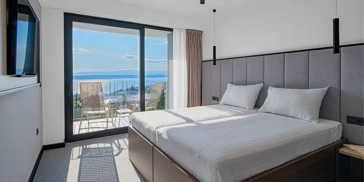 Klimatyzowany pokój z łazienką i balkonem z widokiem na morze