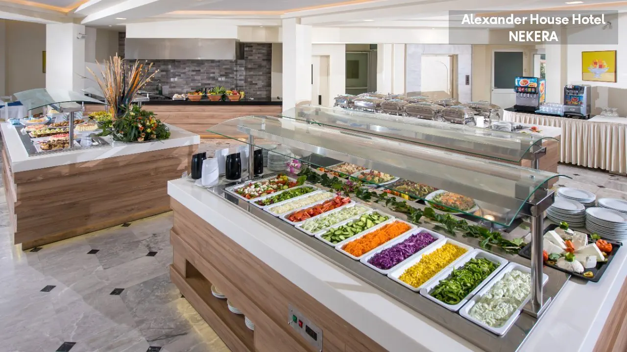 • all inclusive • śniadanie (7.30-10.00, bufet) • obiad (12.15-14.30, bufet) • kolacja (18.45-21.30) • restauracja z tarasem • bar przy basenie (10.00-23.00) • podczas obiadu i kolacji serwowana jest woda, napoje, lokalne piwo i wino • przekąski w barze (10.00-18.00) • płatne importowane napoje alkoholowe i bezalkoholowe • kuchnia lokalna i śródziemnomorska • show cooking