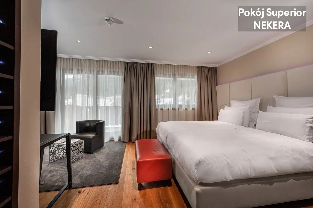 Pokój dwuosobowy kat. 3*: ok. 19 m2, położony na poddaszu, mogący zakwaterować do dwóch osób; jedno łóżko podwójne; TV, sejf, minibar (napoje w cenie), ogrzewanie, prywatna łazienka (wanna lub prysznic, toaleta, suszarka do włosów, szlafrok). Pokój jednoosobowy kat. 3*: ok. 19 m2, położony na poddaszu, mogący zakwaterować jedną osobę; jedno łózko podwójne; poza tym wyposażony jak pokój dwuosobowy 3*. Pokój dwuosobowy Superior: ok. 31 m2, mogący zakwaterować do trzech osób, jedno łóżko podwójne i rozkładana sofa lub łóżko pojedyncze; pokój z balkonem; poza tym wyposażony jak pokój dwuosobowy 3*. Junior Suite: ok. 36 m2, mogący zakwaterować do czterech osób, jedno łóżko podwójne i rozkładana sofa lub dwa łóżka pojedyncze; pokój z balkonem, poza tym wyposażony jak pokój dwuosobowy 3*. Łóżeczko dla dziecka do 2 lat na zapytanie, gratis.