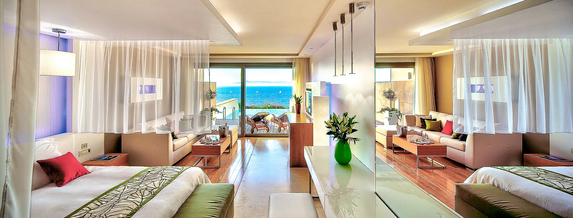 Apartament Elite z widokiem na morze Suite Sea view Elite: ok. 44 m², dla max 3 osób dorosłych i dziecka, łóżko podwójne, sofa, klimatyzacja, sejf , TV-Sat., minibar (płatny), zestaw do parzenia kawy/herbaty, ekspres do kawy, telefon (płatny), prywatna łazienka ( prysznic/wanna, umywalka, lustro, toaleta, mini kosmetyki, suszarka do włosów), umeblowany balkon/taras. Apartament Elite z dostępem do prywatnego basenu Suite Elite Private Pool: ok. 44 m², dla max 3 osób dorosłych i dziecka, łóżko podwójne, sofa, klimatyzacja, sejf , TV-Sat., minibar (płatny), zestaw do parzenia kawy/herbaty, ekspres do kawy, telefon (płatny), prywatna łazienka ( prysznic/wanna, umywalka, lustro, toaleta, mini kosmetyki, suszarka do włosów), umeblowany taras (ok13m2) z leżakami, parasolami oraz prywatnym basenem. Apartament Elite z częściowym widokiem na morze, dostępem do prywatnego basenu i ogrodem Suite partial sea view Elite with private pool and garden: ok. 44 m², dla max 3 osób dorosłych i dziecka, łóżko podwójne, sofa, klimatyzacja, sejf , TV-Sat., minibar (płatny), zestaw do parzenia kawy/herbaty, ekspres do kawy, telefon (płatny), prywatna łazienka ( prysznic/wanna, umywalka, lustro, toaleta, mini kosmetyki, suszarka do włosów), umeblowany taras z prywatnym basenem, leżakami, parasolami oraz prywatnym ogrodem.