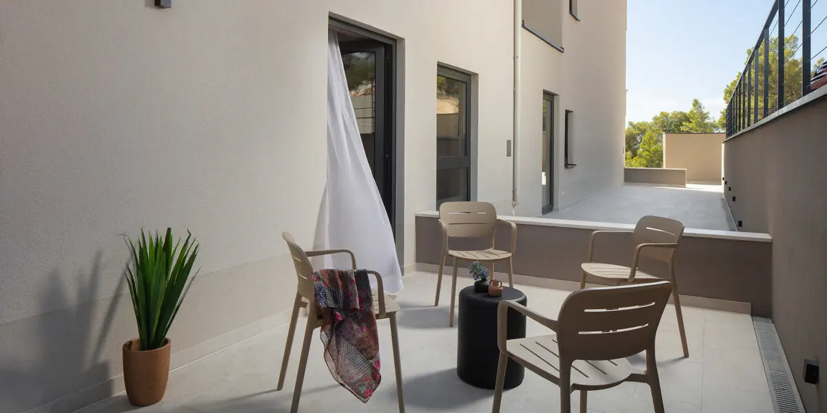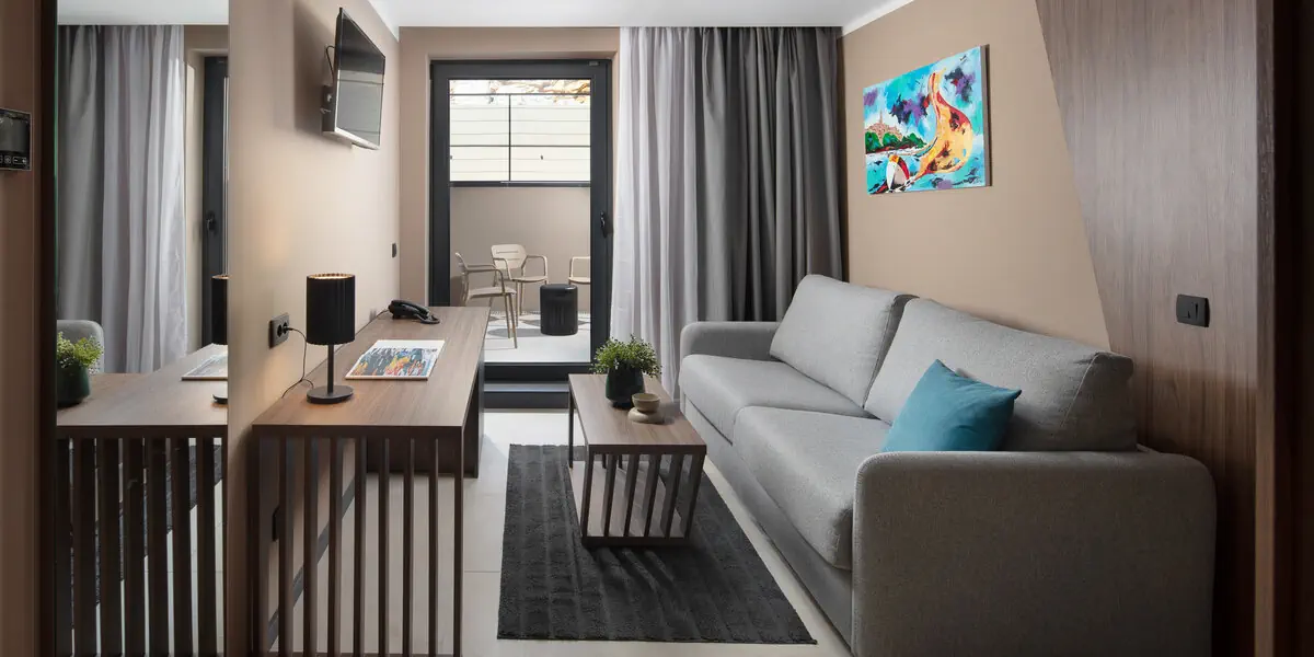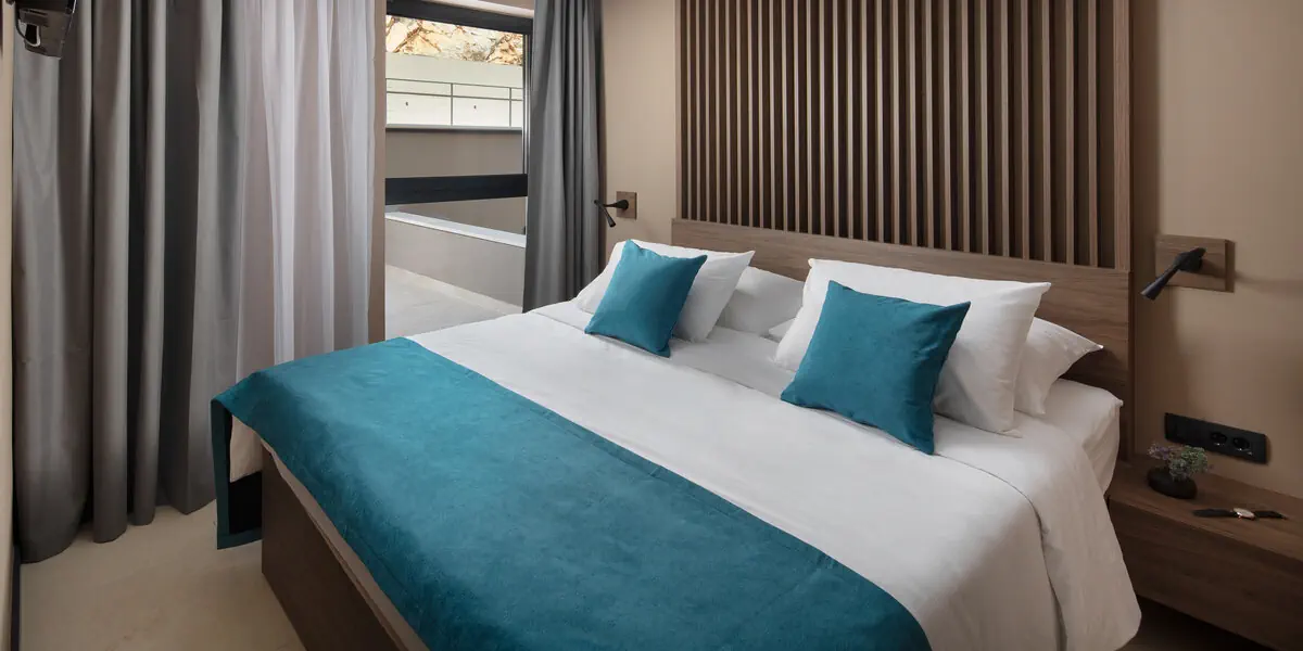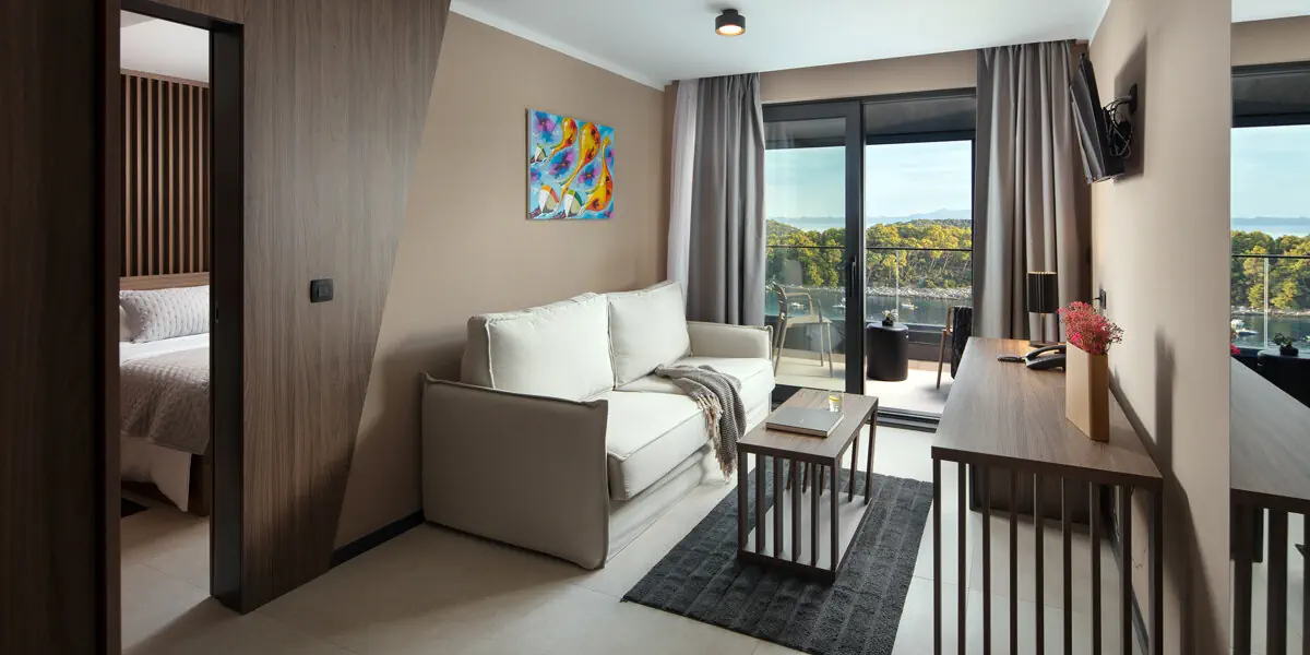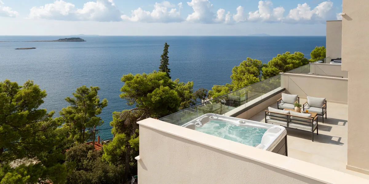 Wygodny klimatyzowany apartament z balkonem z widokiem na morze i prywatnym jacuzzi, odrębną sypialnią oraz z łazienką z prysznicem
