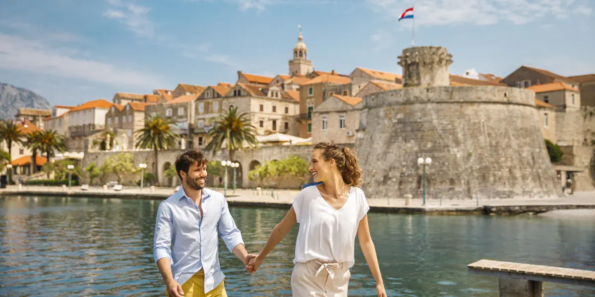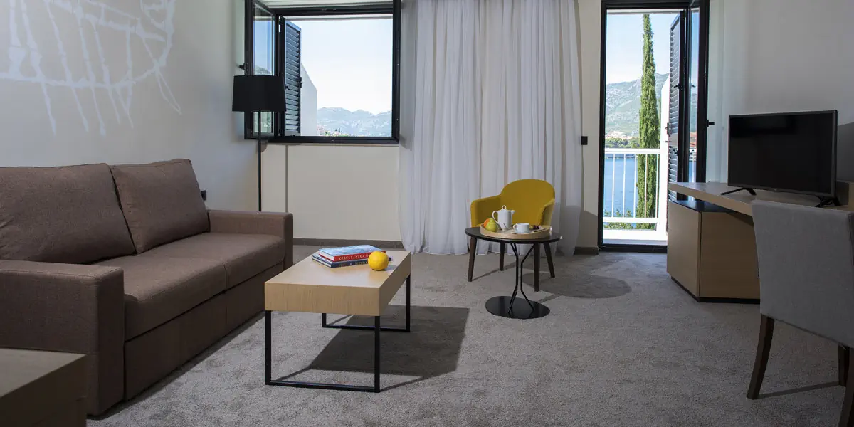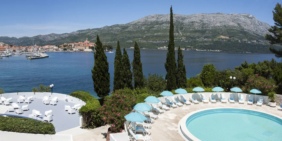 ok. 10 min. pieszo od centrum miejscowości Korcula, na Wyspie Korcula, otoczony śródziemnomorską roślinnością; ok. 140 km od lotniska w Dubrowniku, ok. 180 km od lotniska w Splicie.
