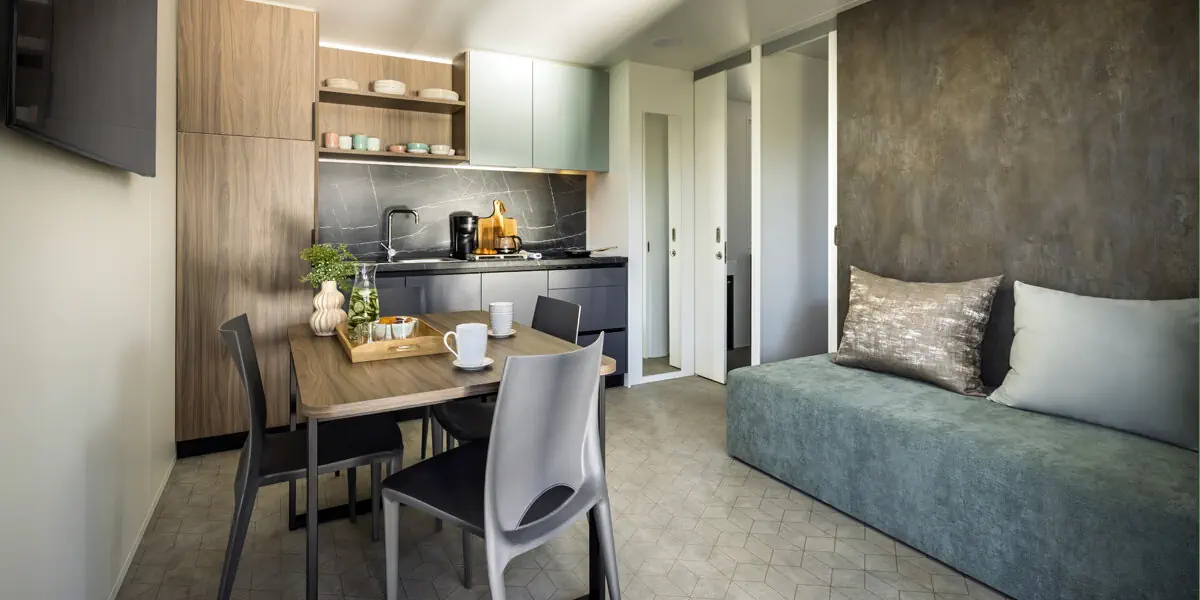 Klimatyzowany, wyposażony domek z 2 sypialniami, salonem i tarasem