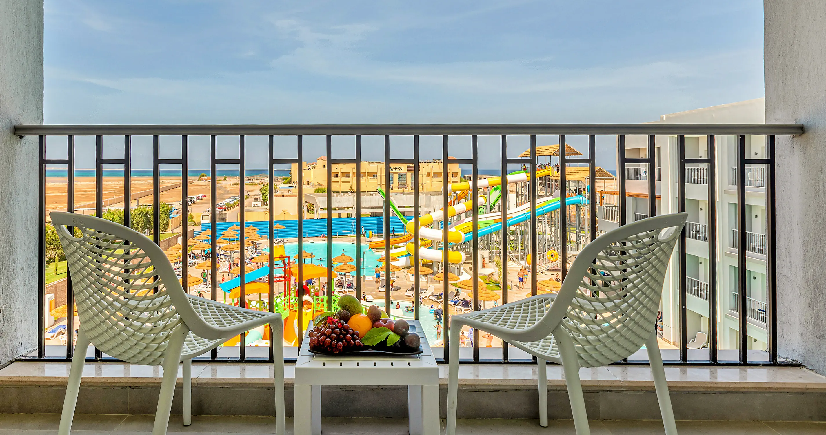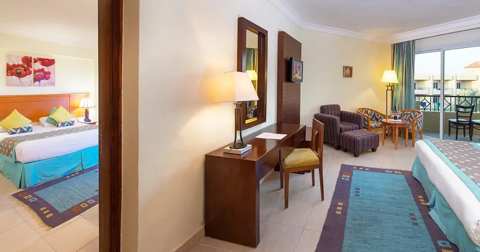 Pokój Standard PV ok. 37 m² Klimatyzacja Łazienka z prysznicem, suszarka do włosów TV-Sat, telefon Czajnik Minibar - uzupełniany codziennie w wodę Sejf - bezpłatny Balkon lub taras Widok na basen Pokój Standard Sea View ok. 37 m² Wyposażenie jak w pokoju Standard Widok na morze Pokój Deluxe SV Wyposażenie jak w pokoju Standard Taras, widok na morze Pokój Family Large PV ok. 45 m² Jedna większa sypialnia Taras, widok na basen Wyposażenie jak w pokoju Standard Pokój Twobedrooms Family PV ok. 70 m² 2 pokoje Standard połączone drzwiami Widok na basen Pokój Family Bunkbed ok. 50 m² Wyposażony w łóżka piętrowe Położone w części przy aquaparku