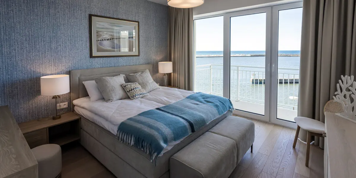 2-pokojowy, przestronny apartament idealny do rodzinnego wypoczynku. Zarówno sypialnia (z łóżkiem kontynentalnym), jak i salon z rozkładaną podwójną sofą, oferują wyjście na balkon, z którego roztacza się widok na morze. Apartament oferuje balkon z bocznym widokiem na morze, z widokiem na plażę wschodnią lub drugi od strony północno- zachodniej. Do tego w pełni wyposażona kuchnia i wygodna łazienka z prysznicem.
