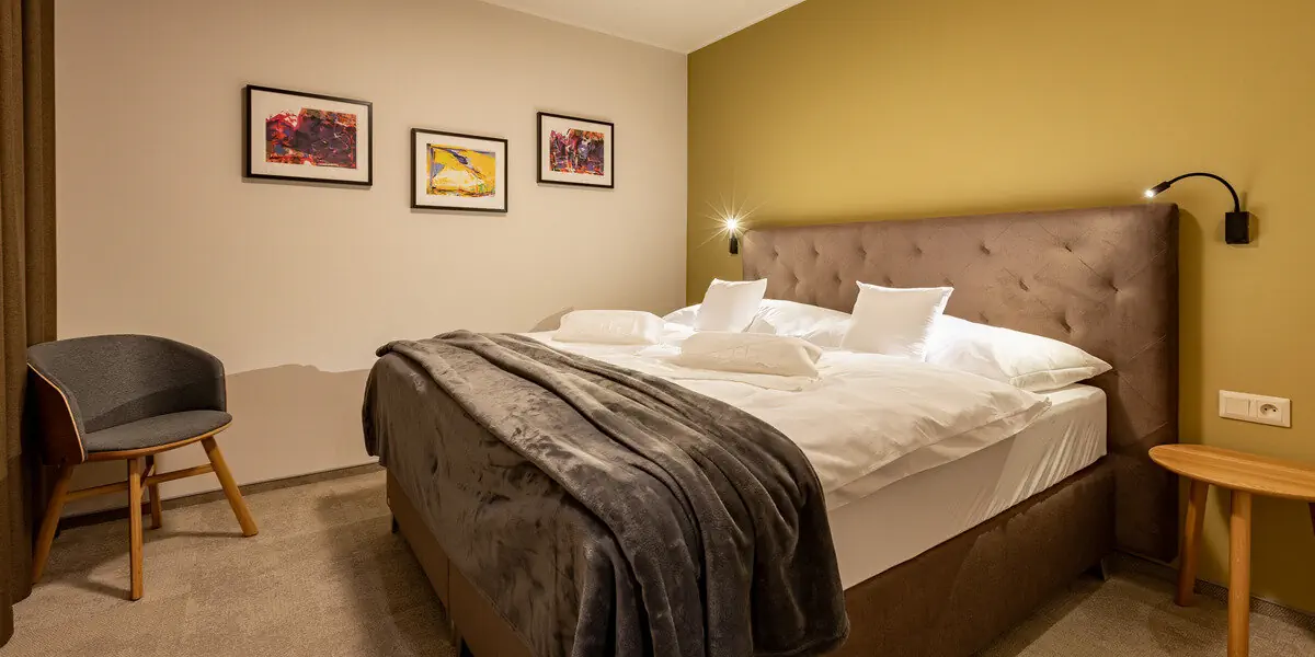 Apartament z osobną sypialnią i salonem z aneksem kuchennym. Część apartamentów posiada balkon.