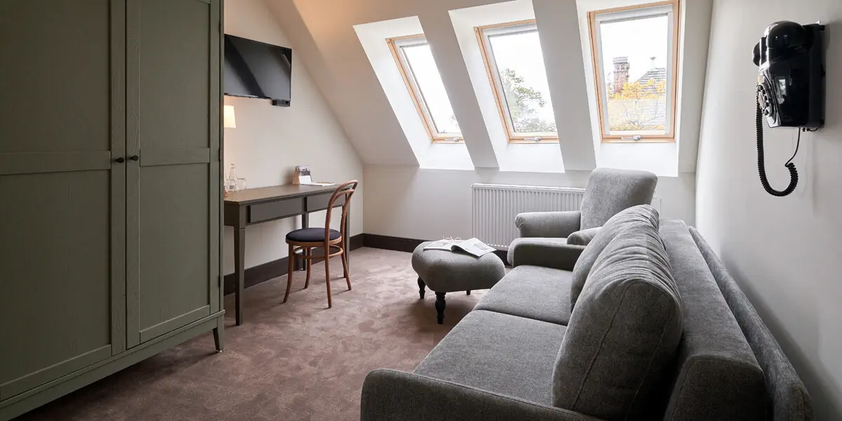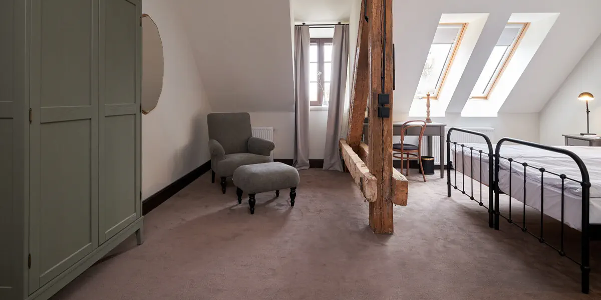 Przestronny pokój rodzinny. W pokoju znajduje się dwuosobowe łóżko 180cm oraz rozkładana sofa, fotel, biurko i łazienka. Pokoje rodzinne są zlokalizowane na 1 piętrze klasztoru, mają okna od strony północnej, wychodzące na patio i park