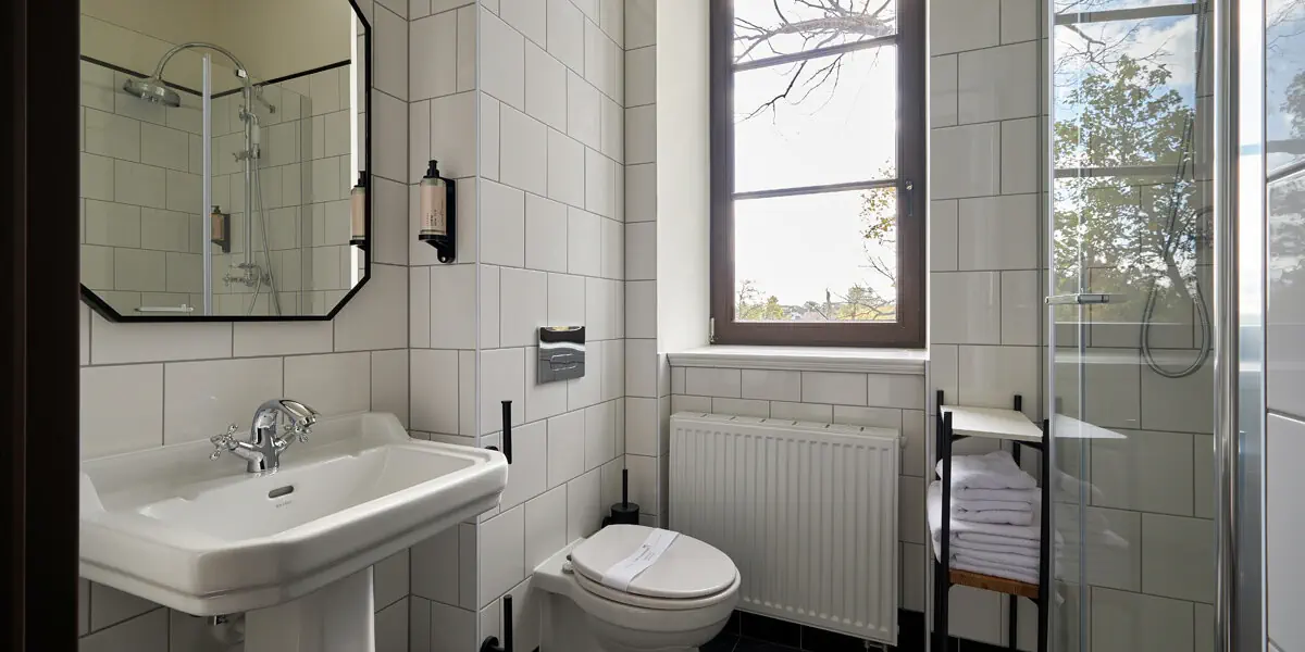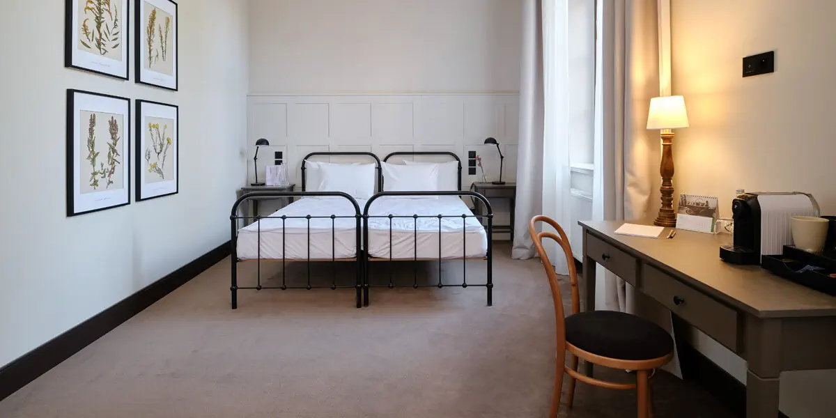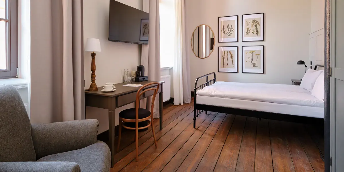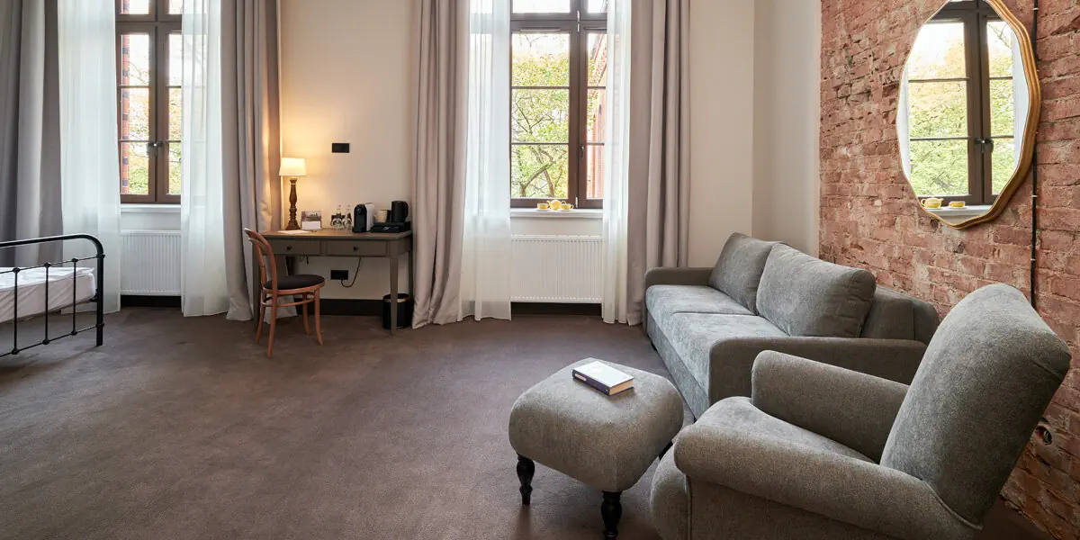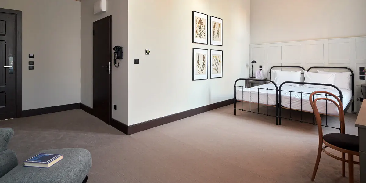 Standardowy, popularny pokój dwuosobowy o metrażu od 16,5 m2 do aż 25 m2. Charakterystyczne ceglane ściany, wysokie i drewniane okna lub klimatyczne pokoje na poddaszu, z oknami mansardowymi lub połaciowymi. Wyposażony m.in. w wygodne łóżko dwuosobowe (min 140cm), biurko i łazienkę z prysznicem.