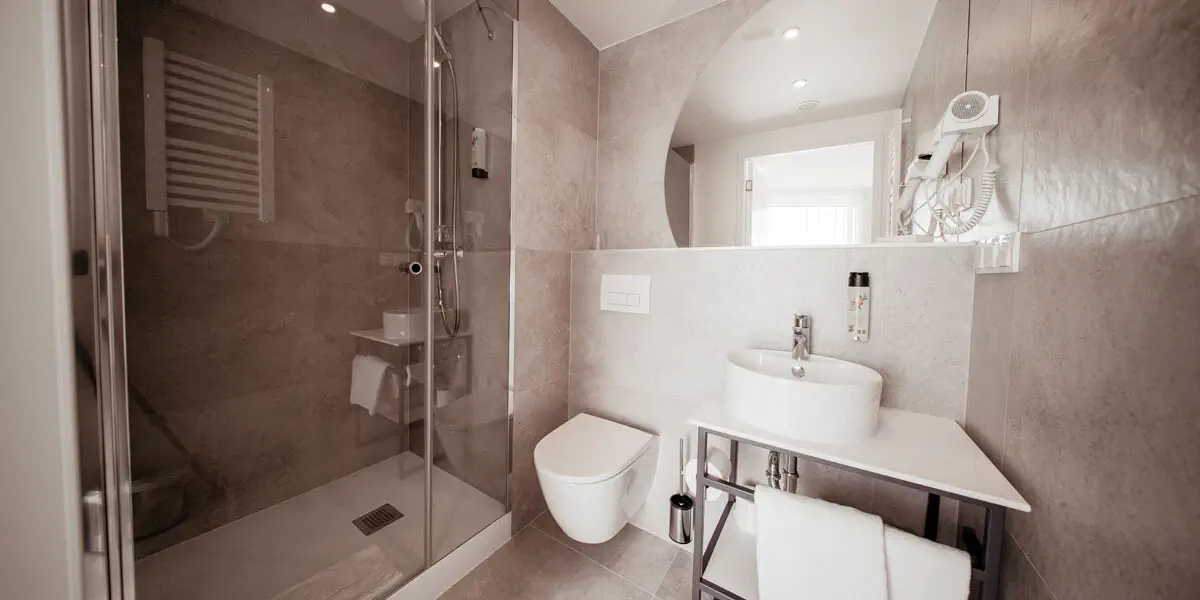 Wygodny pokój z nowoczesną łazienką. W wyposażeniu: łóżko z materacem 180 x 200 cm, szafa, biurko z krzesłem, fotel, szafki nocne, tv, łazienka z prysznicem