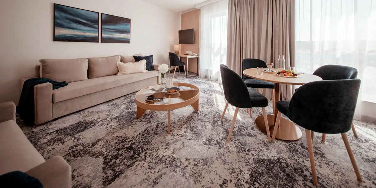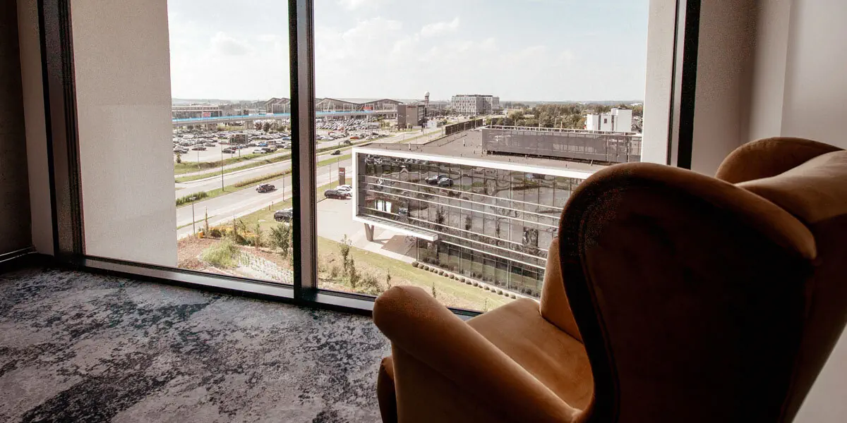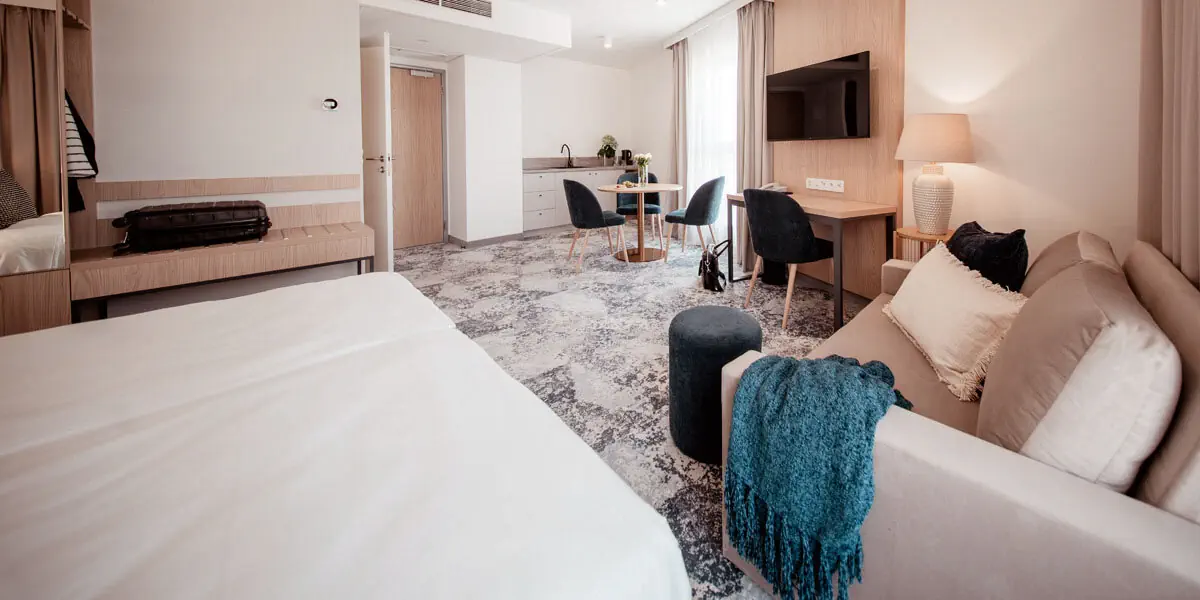 Wygodny 2-pokojowy apartament z widokiem na lotnisko, odrębną sypialnią i aneksem kuchennym. W wyposażeniu: łóżko z materacem 180 x 200 cm, kanapa, szafa, biurko z krzesłem, tv, stół jadalniany z 4 krzesłami, aneks kuchenny wyposażony w zlew, lodówkę, małą płytę indukcyjną, łazienka z prysznicem