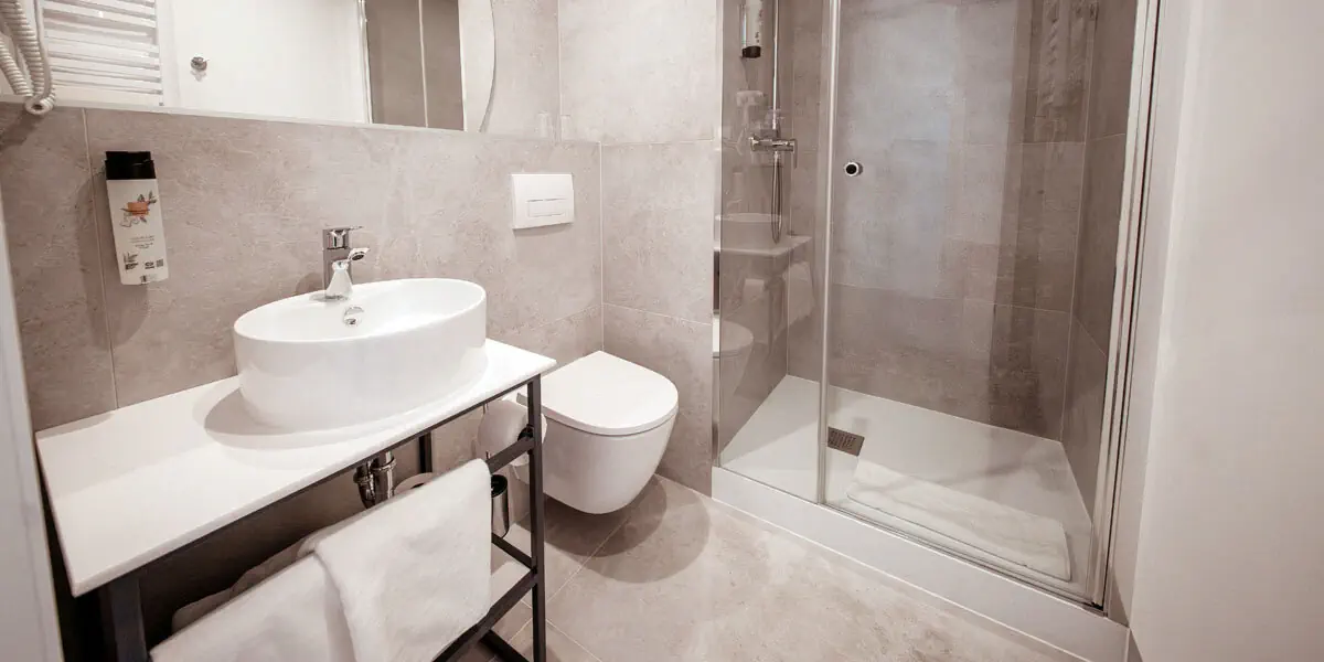 Wygodny pokój z nowoczesną łazienką. W wyposażeniu: 2 łóżka z materacem 90 x 200 cm, szafa, biurko z krzesłem, fotel, szafki nocne, tv, łazienka z prysznicem