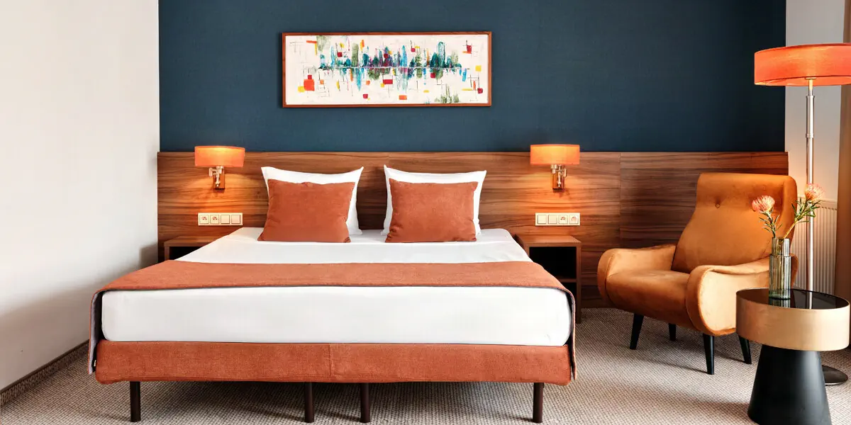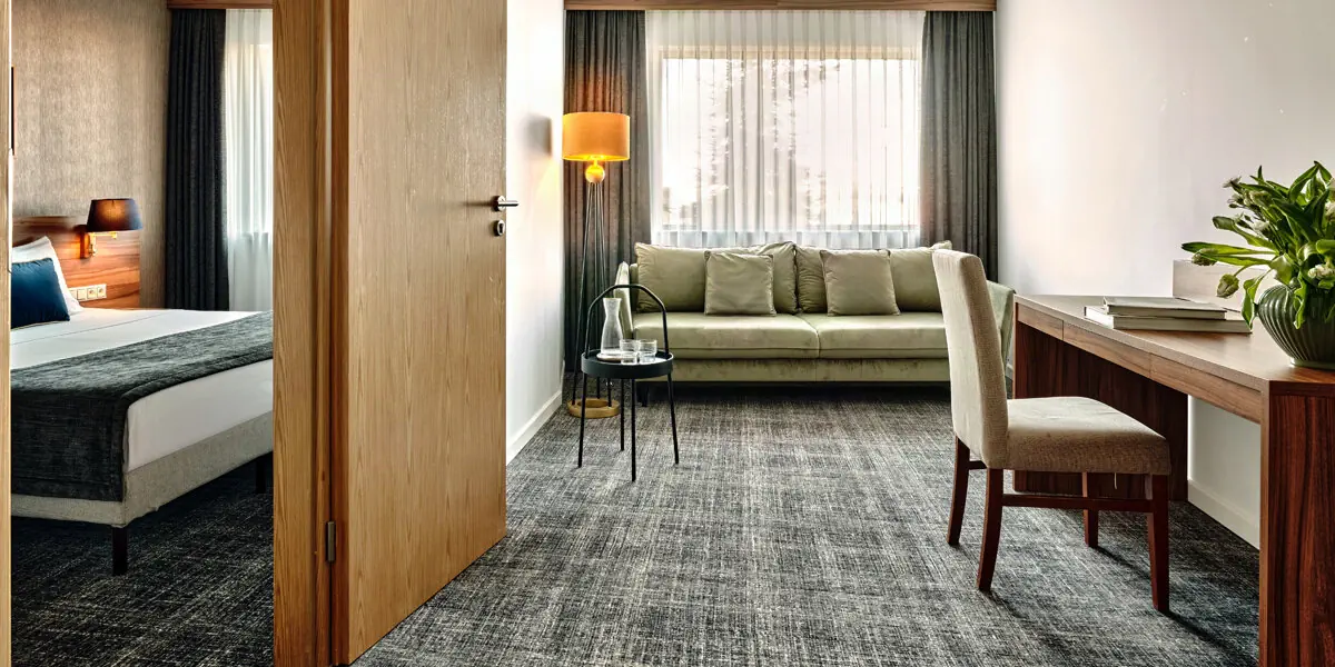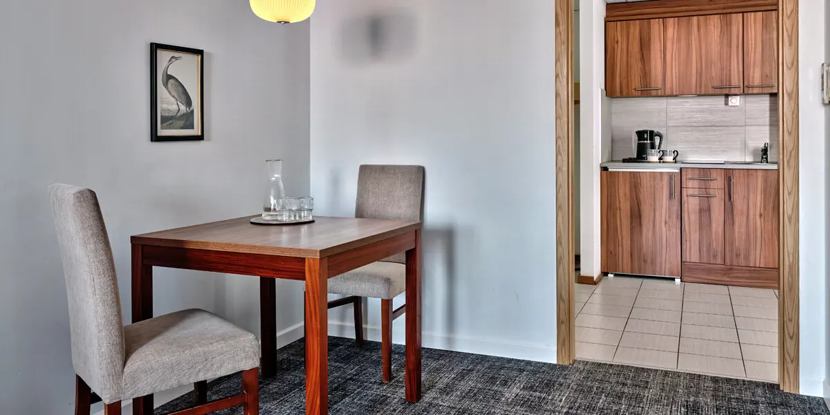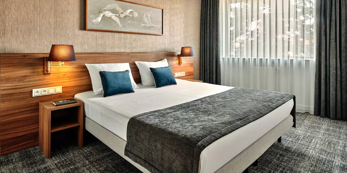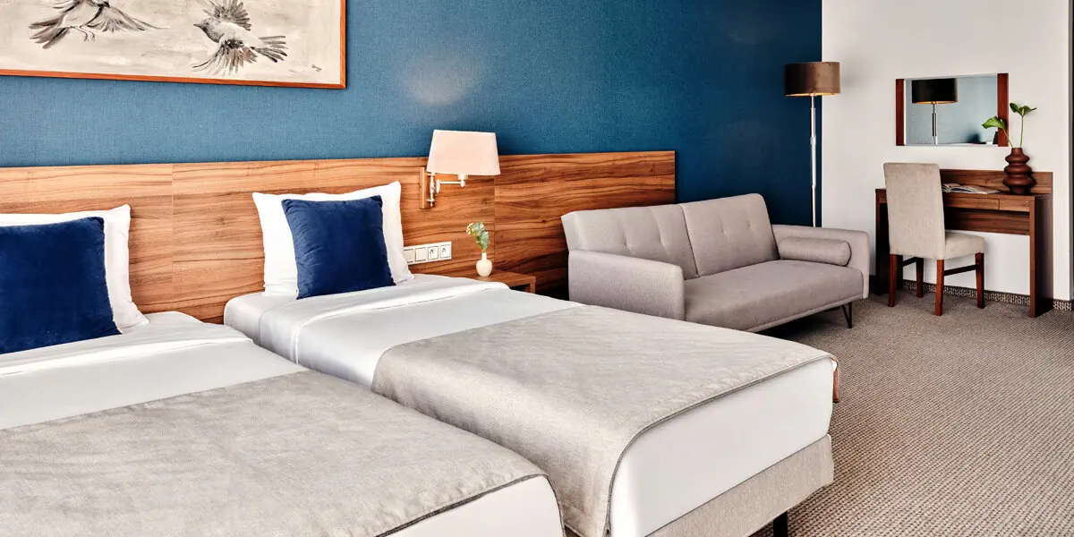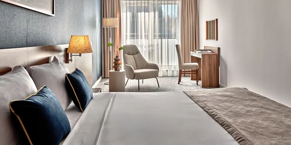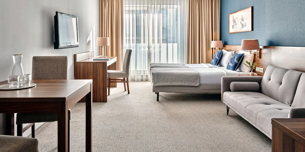Komfortowy klimatyzowany pokój z częścią wypoczynkową (38 m2). W wyposażeniu: TV, WI-FI, zestaw do parzenia kawy/herbaty, aneks kuchenny z lodówką. Prywatna łazienka z prysznicem, suszarką do włosów, ręcznikami i zestawem kosmetyków.