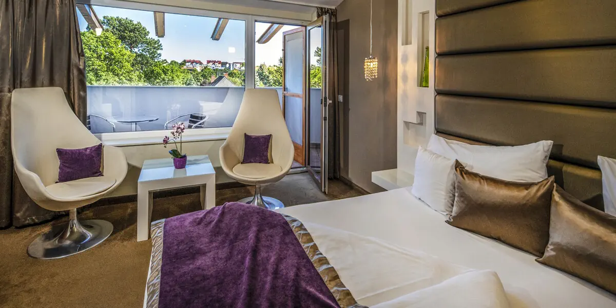 Wygodny i bogato wyposażony pokój z balkonem, klimatyzacją i łazienką. Goście mogą bezpłatnie korzystać z 6 napojów bezalkoholowych z minibaru dziennie