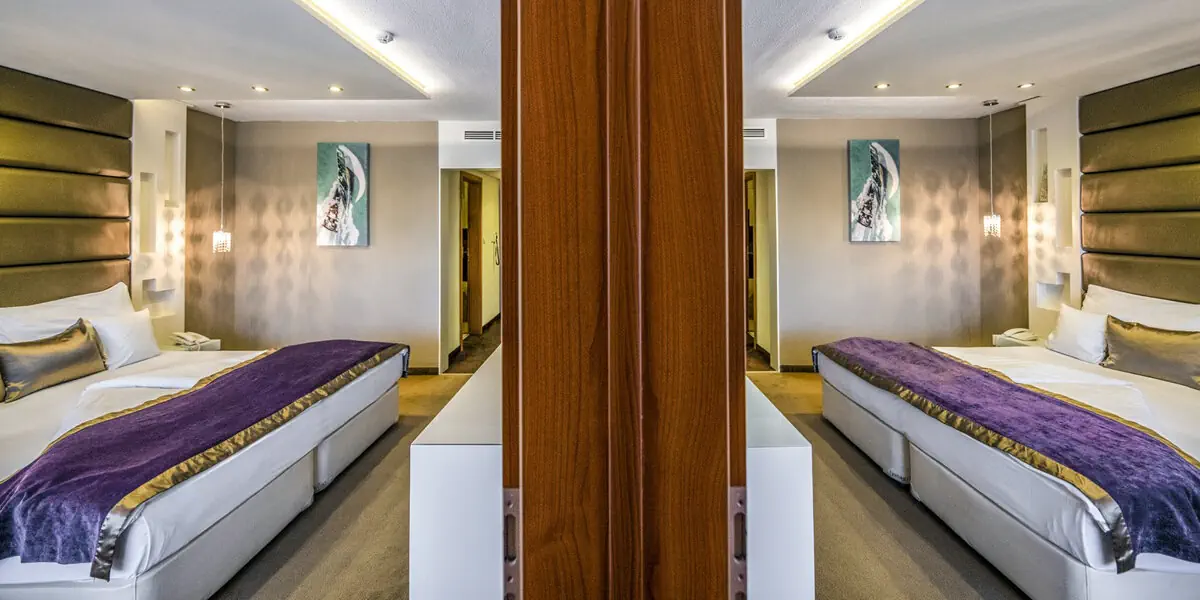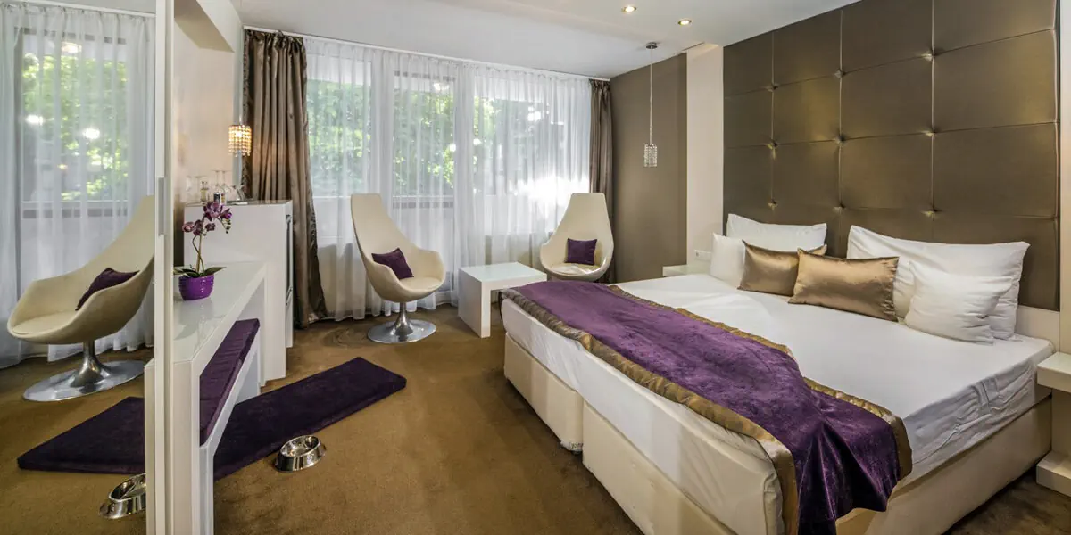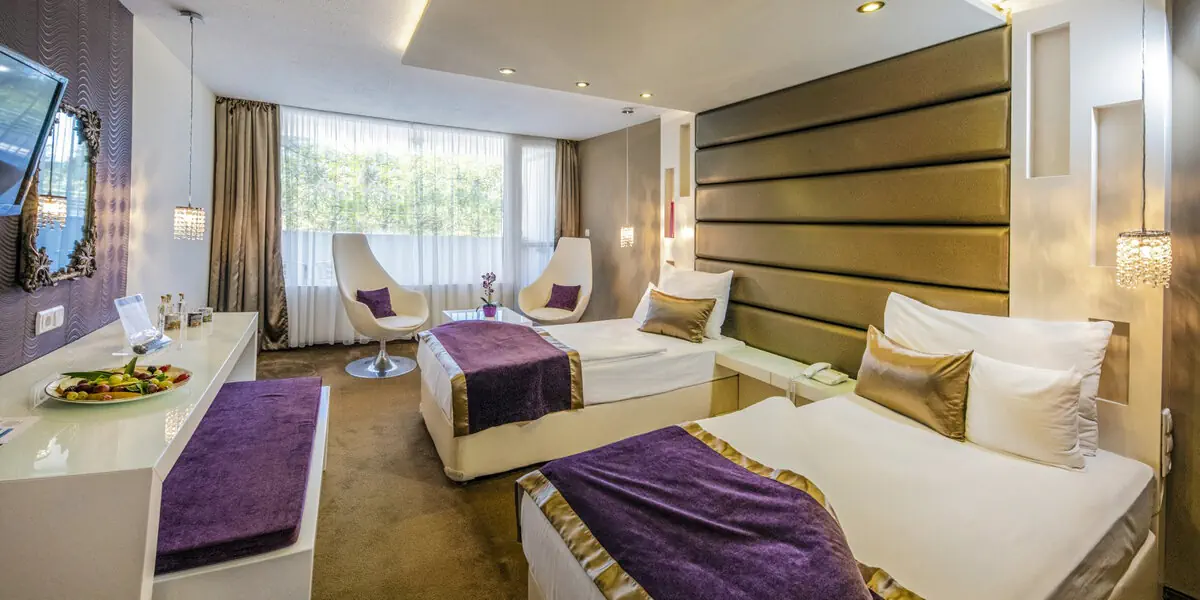 Wygodny i bogato wyposażony pokój z balkonem, klimatyzacją i łazienką. Potrzebę posiadania wyposażonego minibaru w pokoju należy zgłosić wcześniej w recepcji