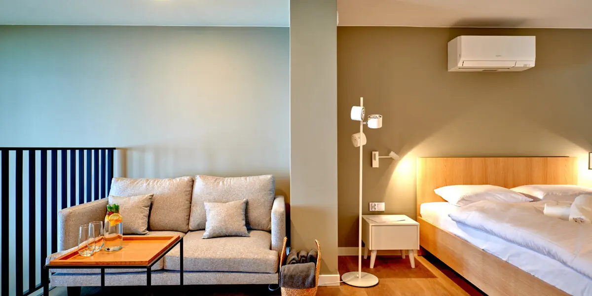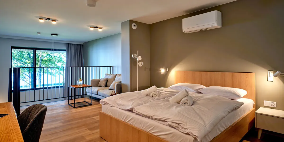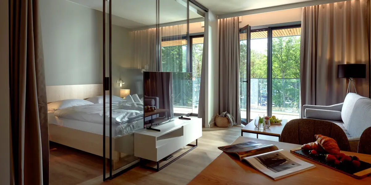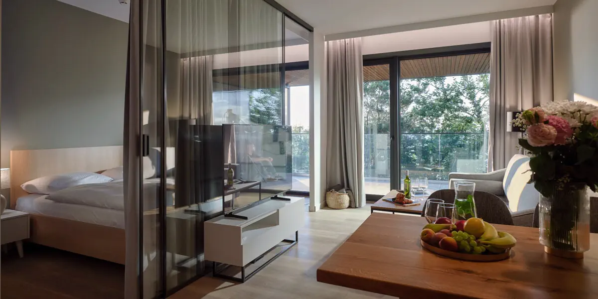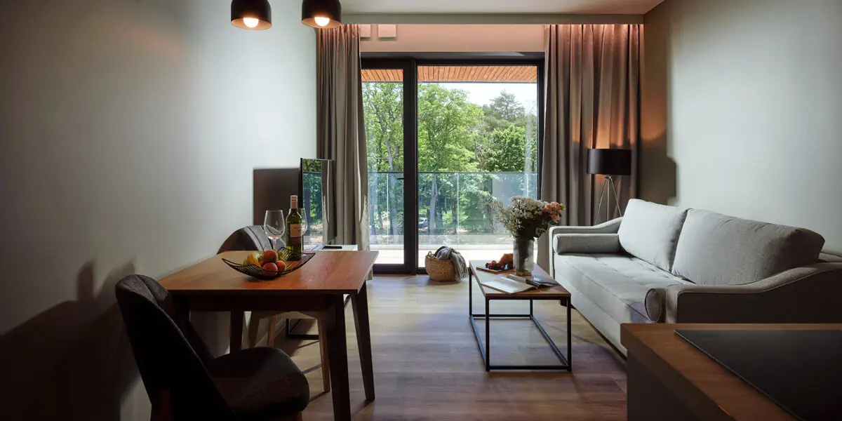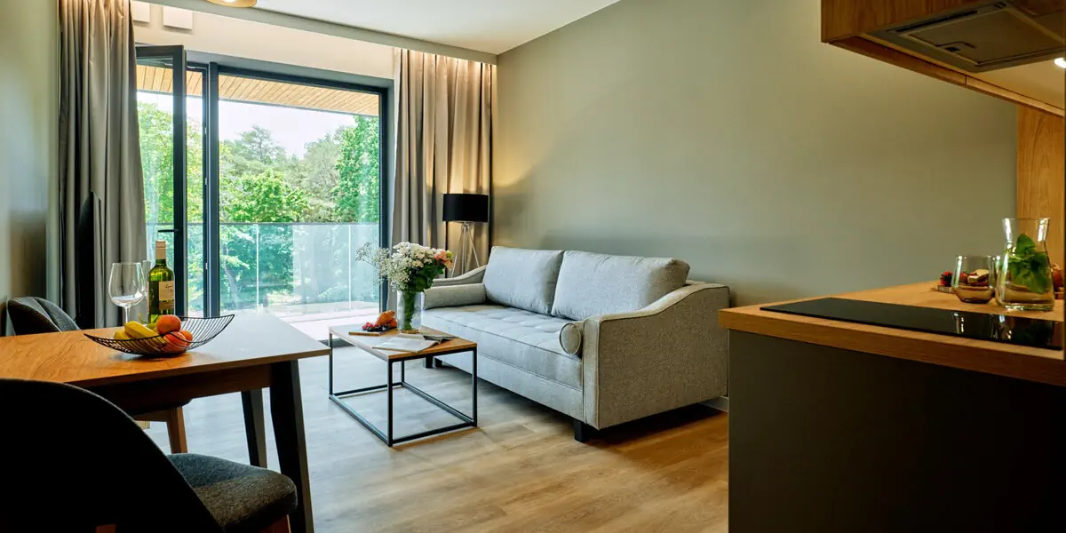 Komfortowy pokój z balkonem, odrębną częścią sypialnianą oraz pokojem dziennym z aneksem kuchennym i widokiem na las. Dostawki na rozkładanej sofie