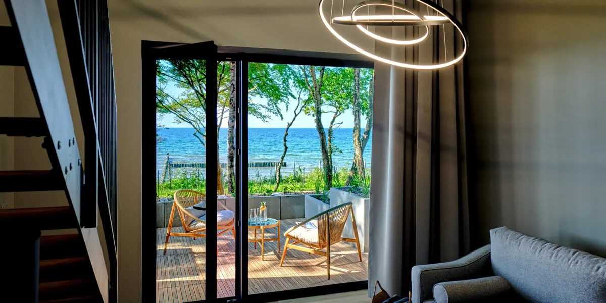 Dwupoziomowy apartament z sypialnią na antresoli, z widokiem na spokojny las. Doskonały dla osób szukających unikalnego układu przestrzeni i nadmorskiej atmosfery. Na dole część dzienna z sofą i aneksem kuchennym oraz wyjściem na balkon/taras. Dostawki na rozkładanej sofie