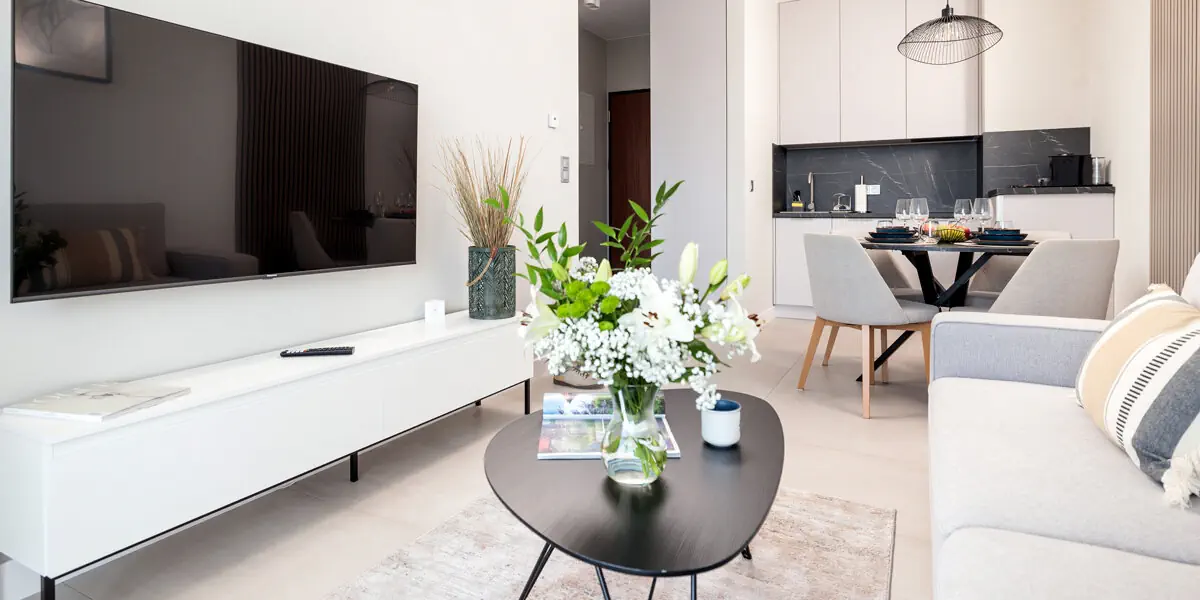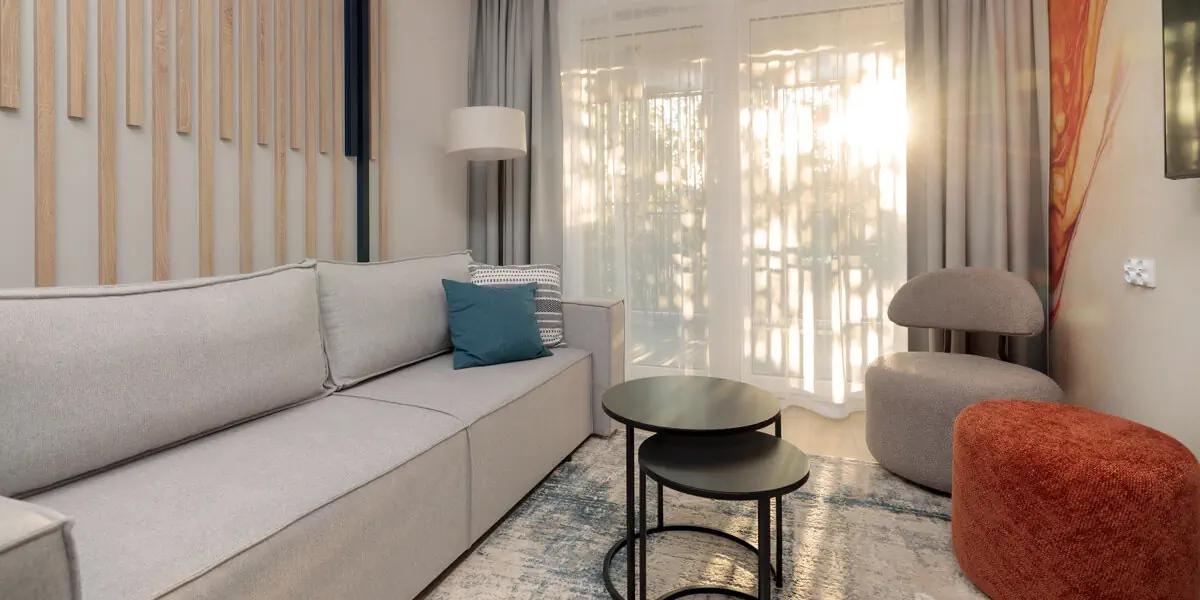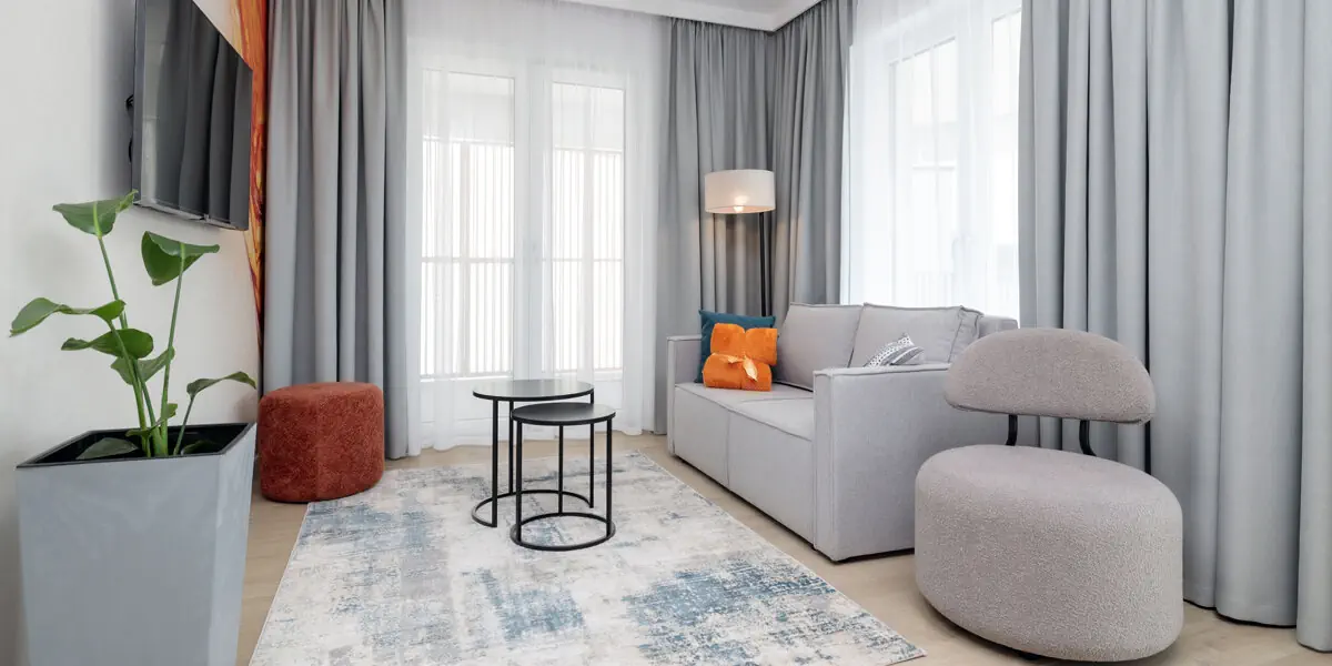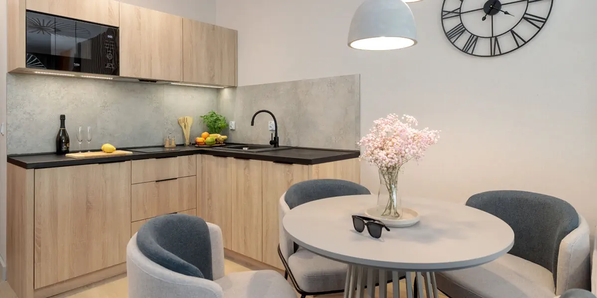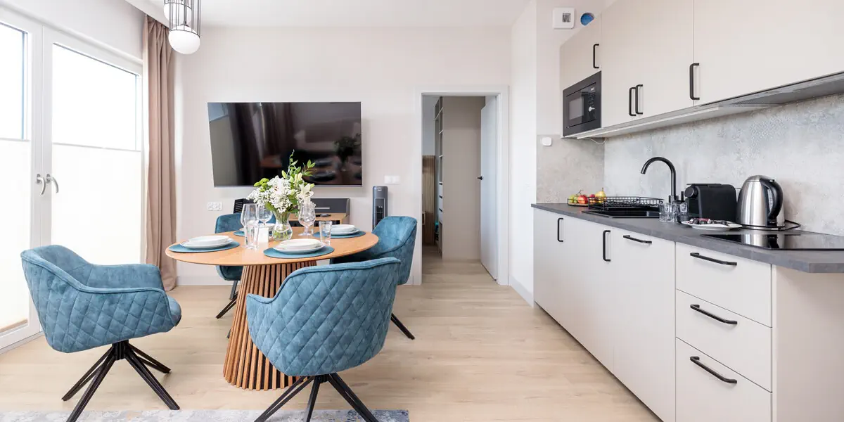 Nowoczesny apartament z aneksem kuchennym, balkonem i łazienką. Dostawki na rozkładanej kanapie