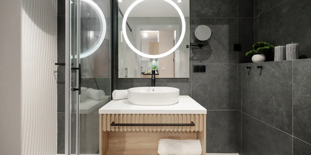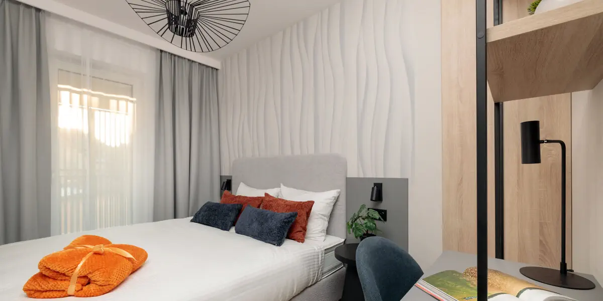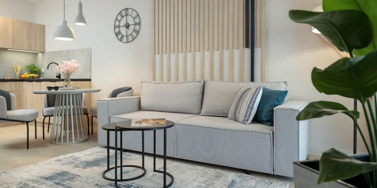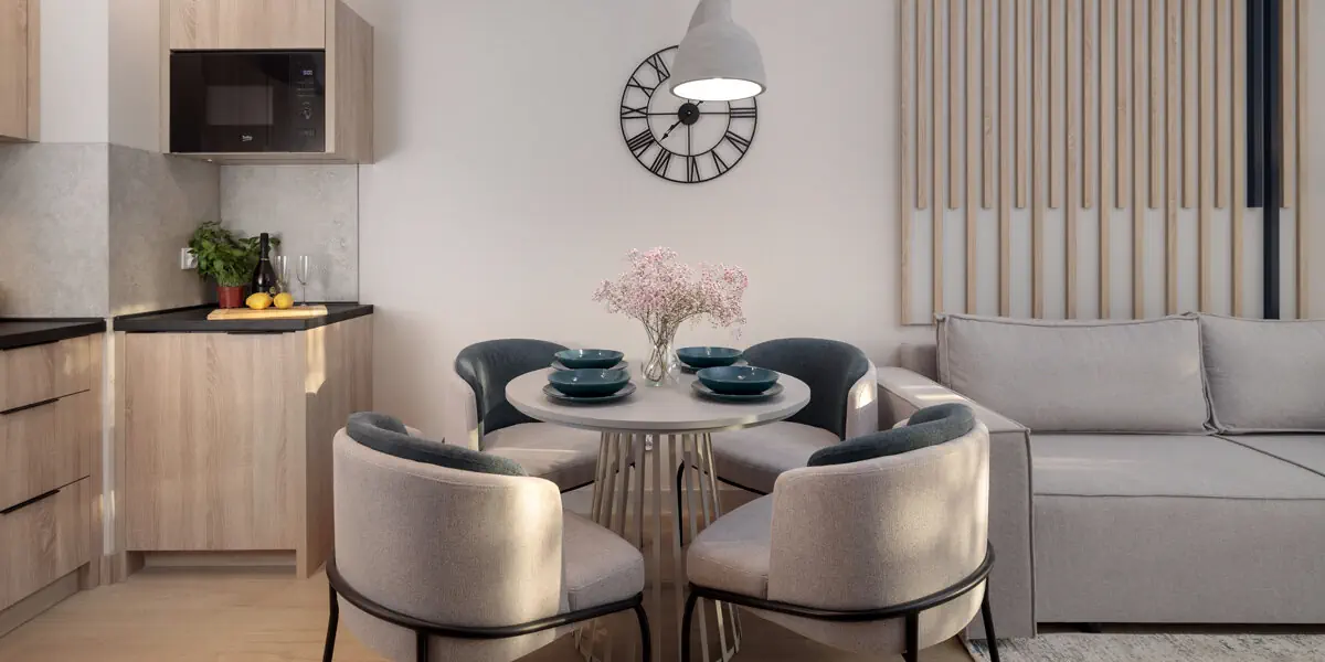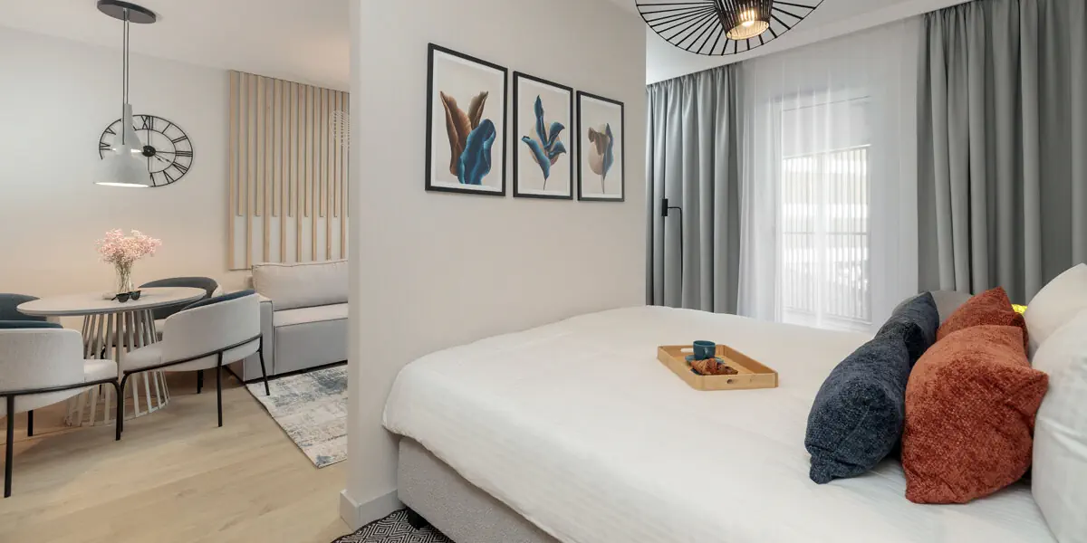 Nowoczesny apartament typu studio z aneksem kuchennym, balkonem i łazienką. Dostawki na rozkładanej kanapie