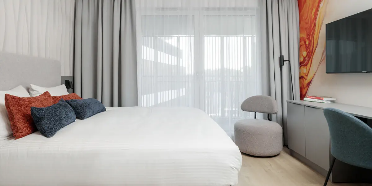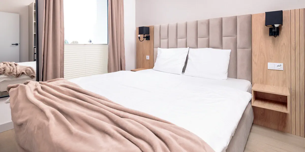 Nowoczesny apartament z odrębną sypialnią, aneksem kuchennym, balkonem i łazienką. Dostawki na rozkładanej kanapie w salonie