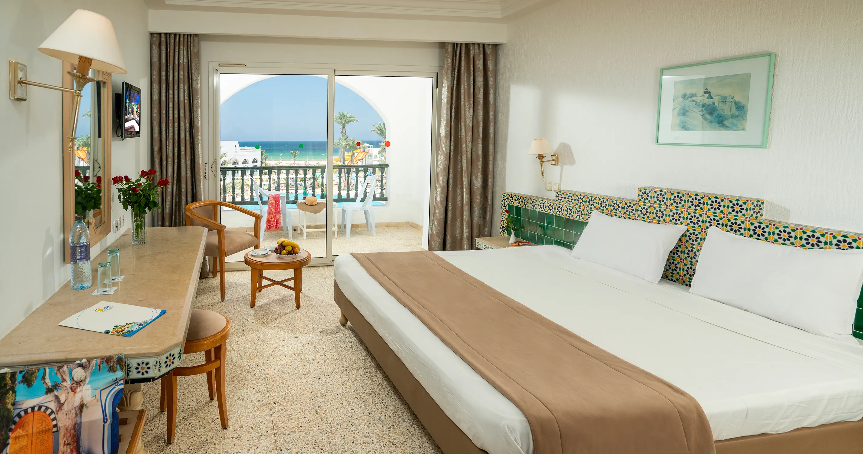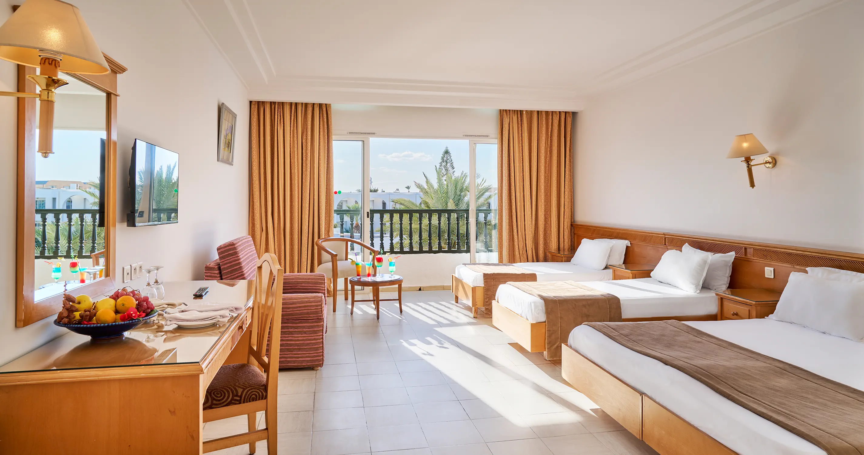 Pokój Standard ok. 26 m² - Klimatyzacja centralna (15.06-15.09) - Łazienka z prysznicem lub wanną, toaleta, suszarka do włosów - TV-Sat, telefon - Minilodówka - bezpłatna (uzupełniana woda butelkowana w dniu przyjazdu) - Sejf - wymagany depozyt ok. 5 TND/ pokój/ dzień + 50 TND kaucja - Łóżeczko dla dziecka (na życzenie) - bezpłatne - Balkon lub taras Pokój Standard 4-4 ok. 38 m² - Wyposażenie jak w pokoju standard - Bardziej przestronny - Maksymalne obłożenie od 2 dorosłych + 2 dzieci do 4 dorosłych Pokój Connecting - Wyposażenie jak w pokoju Standard - 2 pokoje połączone drzwiami, 2 łazienki Pokój Promo - Wyposażenie jak w pokoju Standard