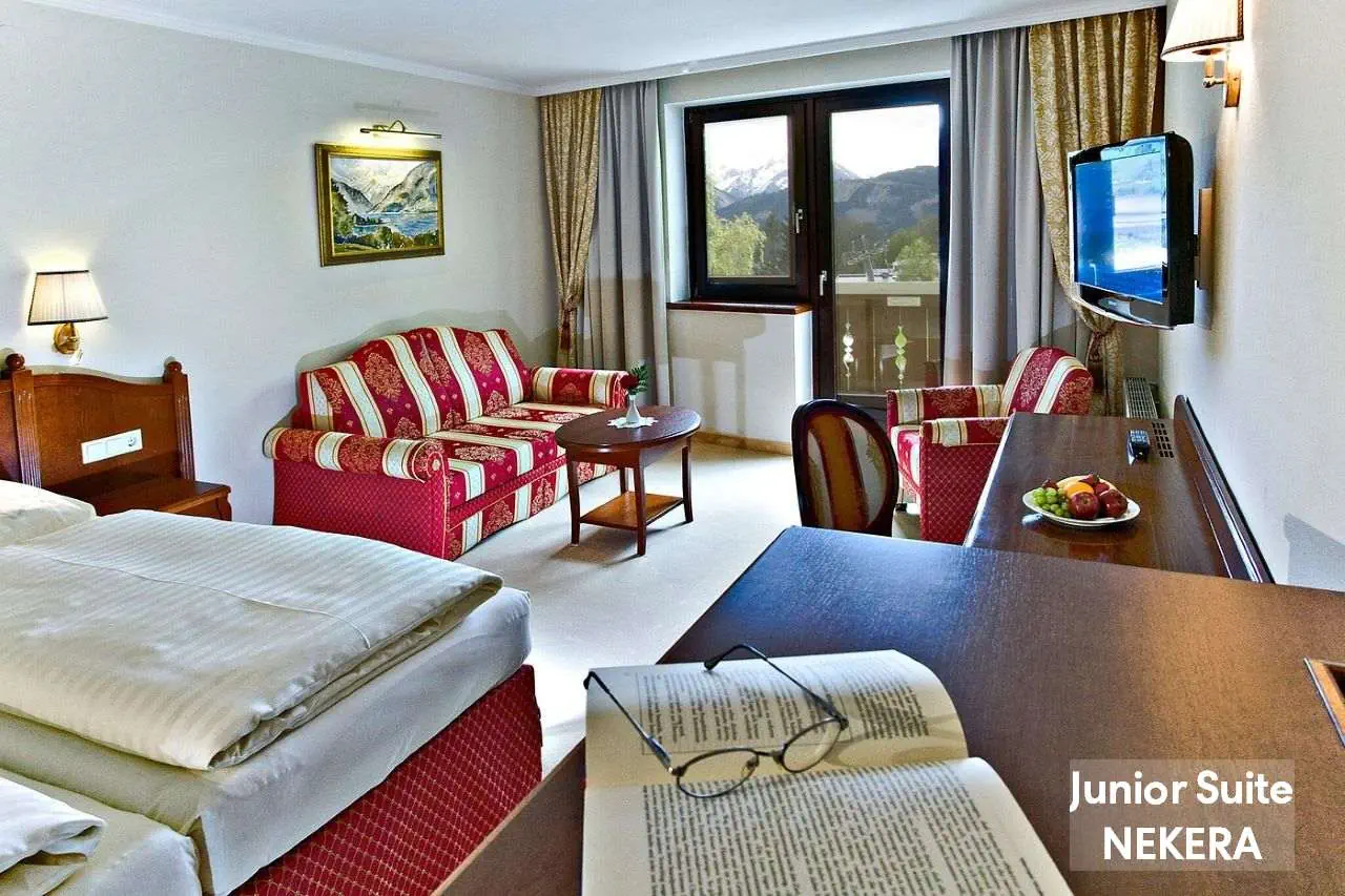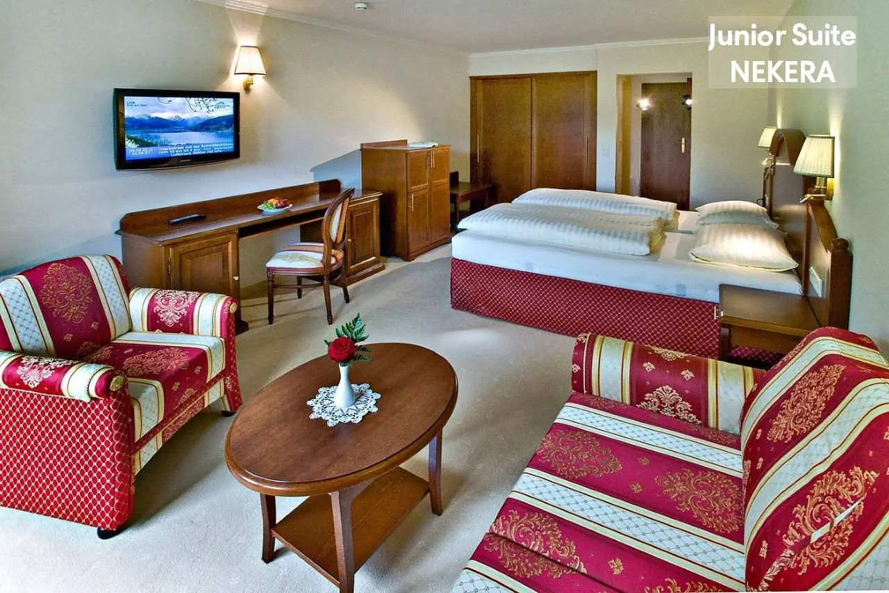 komfortowe, nowocześnie urządzone Pokoje Dwuosobowe Standard: ok. 20 m2; ogrzewanie, TV-Sat., telefon, sejf, minibar, zestaw do parzenia kawy / herbaty, balkon, wanna lub prysznic, WC, suszarka, szlafrok. Junior Suite (JS Typ 2): przestronniejsze, ok. 25 m2; dodatkowo kącik wypoczynkowy i rozkładana sofa. Balkon z widokiem na góry; poza tym wyposażone jak pokoje dwuosobowe. Junior Suite z widokiem na jezioro (JS Typ 3).