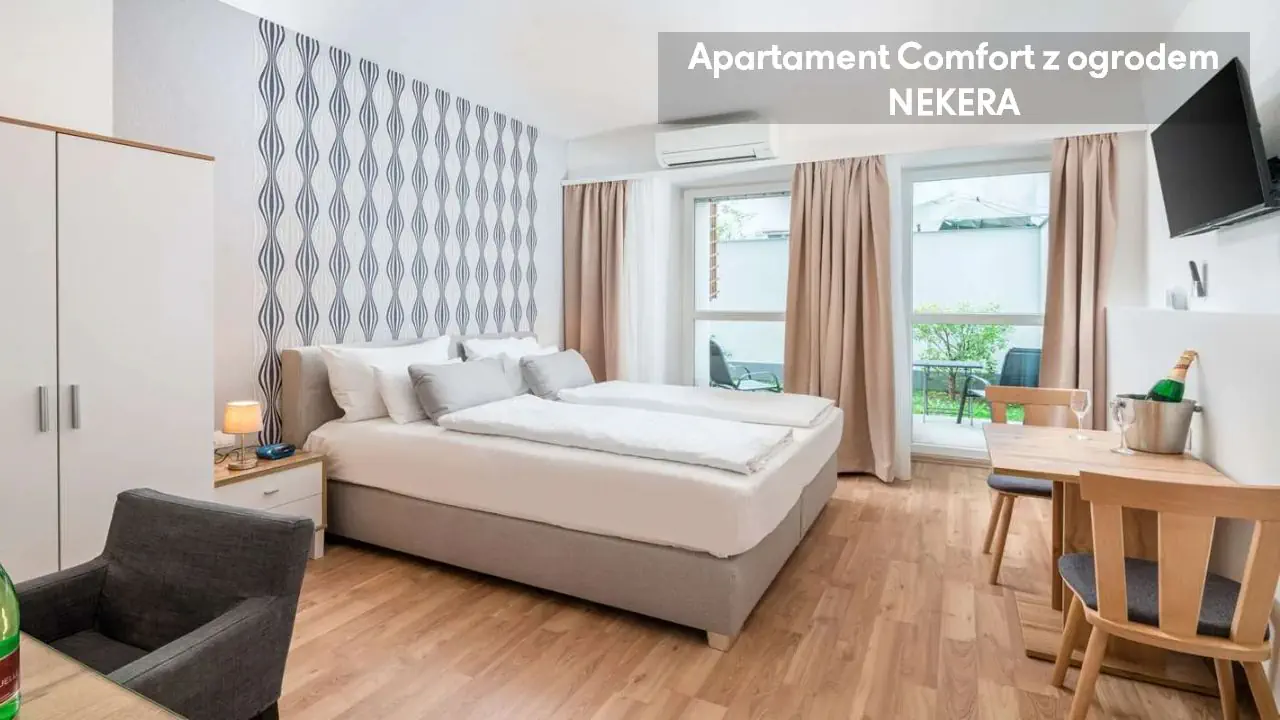 Studio: ok. 30 m2, mogący zakwaterować do dwóch osób, jedno łóżko podwójne, TV, biurko, aneks kuchenny, ekspres do kawy, stół, prywatna łazienka (wanna lub prysznic, toaleta, umywalka,). Apartament Comfort z ogrodem: ok. 30 m2, mogący zakwaterować do dwóch osób, jedno łóżko podwójne, pokój z wyjściem na ogród; poza tym wyposażony jak Studio. Apartament Superior: ok. 30 m2, sypialnia z łóżkiem podwójnym i część dzienna z rozkładaną sofą; poza tym wyposażony jak Studio.