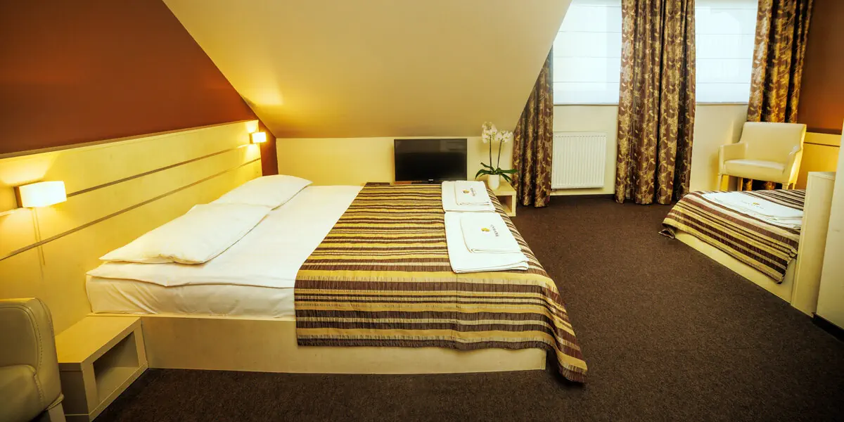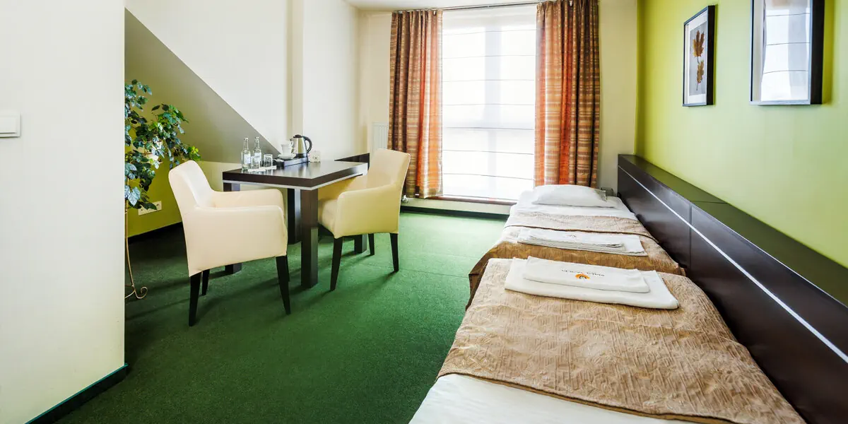 Komfortowy pokój wyposażony w: TV LCD, Internet Wi-Fi, czajnik elektryczny, łazienkę z prysznicem lub wanną, ręcznikami i kosmetykami.