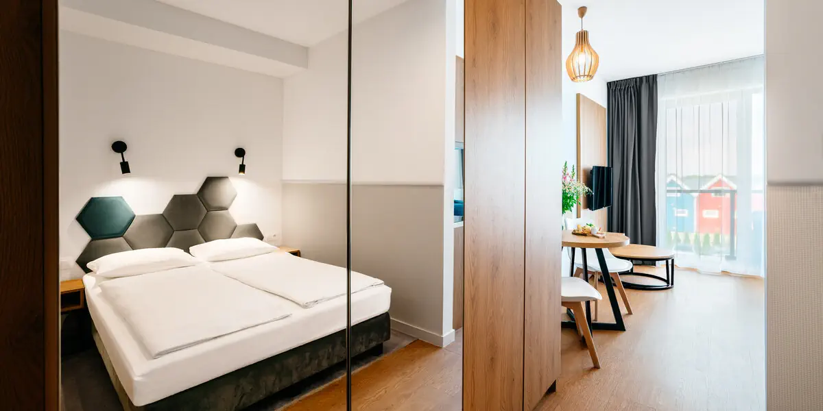 Komfortowy apartament jednopokojowy wyposażony w: bezprzewodowy dostęp do internetu, telewizor, klimatyzację, aneks kuchenny (lodówka z zamrażalnikiem, zmywarka, kuchenka mikrofalowa, płyta ceramiczna, czajnik elektryczny, komplet naczyń i sztućców), łazienkę (kabina prysznicowa, suszarka do włosów, ręczniki, mydło), pralkę, zaciemniające zasłony, leżaki i parawan. Apartament znajduje się w budynku A (restauracja i basen mieszczaą się w budynku B)