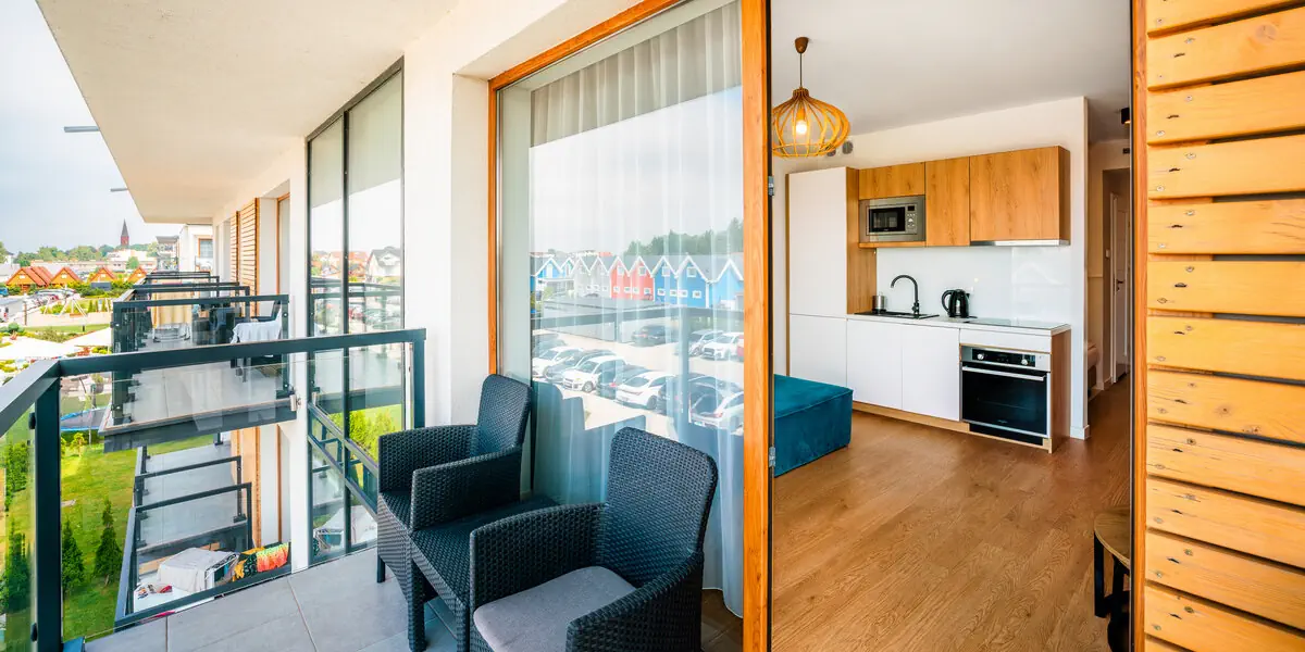 Komfortowy apartament wyposażony w: bezprzewodowy internet, telewizor, klimatyzację, oddzielną sypialną z dużym łóżkiem małżeńskim, salon z częścią wypoczynkową (rozkładana 2-os sofa), dodatkowo wydzieloną wnęką sypialnianą dla dzieci z aneksem kuchennym (lodówka z zamrażalnikiem, zmywarka, kuchenka mikrofalowa, płyta ceramiczna, piekarnik, czajnik elektryczny, komplet naczyń i sztućców), łazienkę (kabina prysznicowa, suszarka do włosów, ręczniki, mydło), zaciemniające zasłony, leżaki, parawan. Apartament znajduję się w budynku A (restauracja i basen mieszczą się w budynku B)
