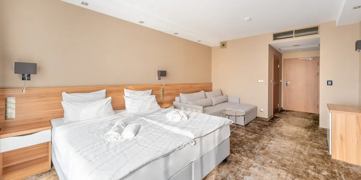 - Codzienne śniadanie w formie bufetu - Codzienna obiadokolacja w formie bufetu - Dla pobytów 23.12-26.12: Wspólne malowanie bombek i ubieranie choinki, Uroczysta Kolacja Wigilijna z wizytą Świętego Mikołaja oraz wspólne kolędowanie, świąteczne śniadania, ognisko, nieograniczony dostęp do sali zabaw oraz kreatywne zajęcia z animatorami, jednorazowy rabat na menu a la carte w wysokości 10%, przedłużona doba hotelowa do godziny 13:00 (w dniu 26.12) - Dla pobytów 30.12-02.01: Ognisko z muzyka na żywo, Bal Sylwestrowy (welcome drink na powitanie, specjalne menu, różnorodne bufety dań gorących oraz zimnych przekąsek, słodki stół, porywająca do tańca muzyka, open bar) Bal Sylwestrowy dla najmłodszych (specjalne powitanie, bufet dań gorących, zimnych przekąsek oraz napoi, bogaty program animacji, zabawa w rytmie dziecięcych hitów, konkursy z nagrodami), uroczyste śniadanie noworoczne oraz brunch noworoczny, afterparty w hotelowym klubie, dnia 01.01 przedłużona doba hotelowa do godz. 13:00 - Dostęp do strefy wellness: kryty basen, jacuzzi, sauna fińska, ziołowa i łaźnia parowa - Dostęp do salki gimnastycznej - Dostęp do sali zabaw i placu zabaw dla dzieci - Wypożyczenie kijków do nordic walking - Internet Wi-Fi - Podatek VAT
