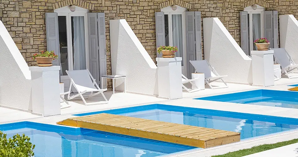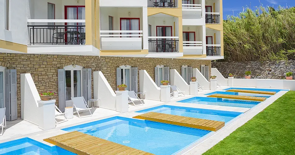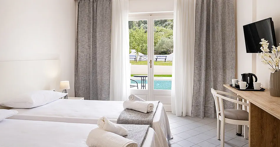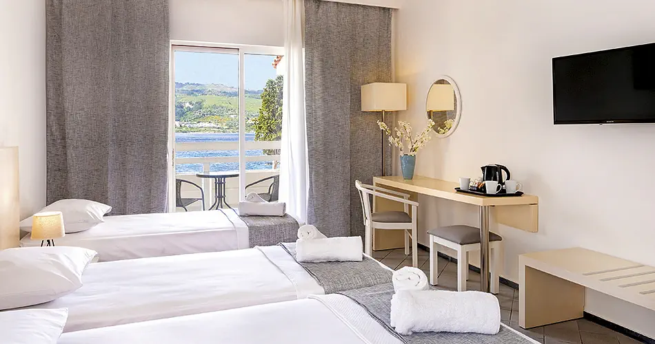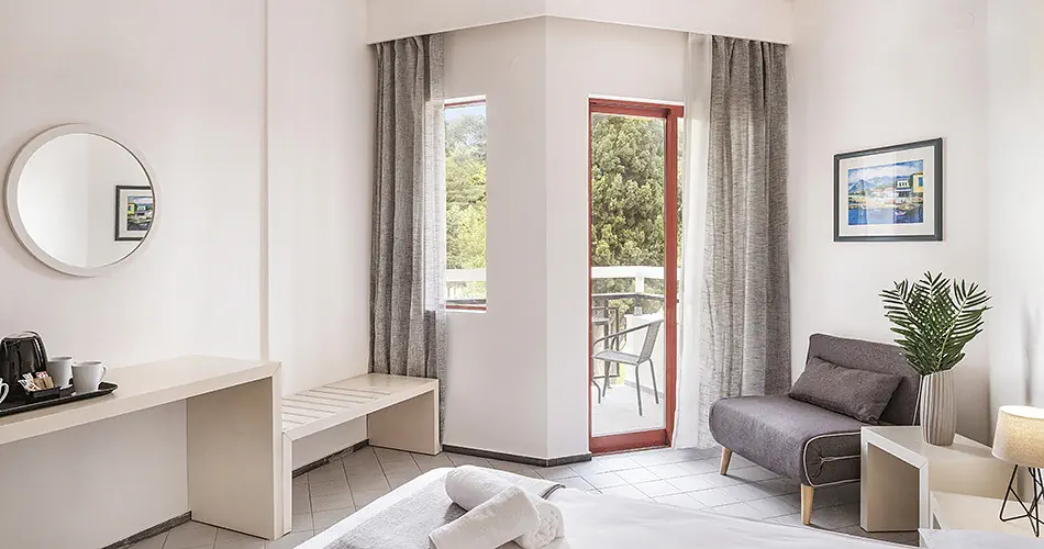 Pokój Double - Klimatyzacja - bezpłatna - Łazienka z prysznicem i WC, suszarka do włosów - Telefon, TV-SAT - Sejf - bezpłatny - Mini lodówka- bezpłatna - Balkon lub taras - Łóżeczko dziecięce na zapytanie - bezpłatne - Dostawka dla trzeciej osoby ma około 160 cm. długości (tylko w pokojach typu Sea View dostawki pełnowymiarowe) Pokój Double SSV-PV - Pokój z bocznym widokiem na morze i basen - Wyposażenie jak w pokoju Double Pokój Double Private Pool - Pokój z bezpośrednim dostępem do prywatnego basenu - Wyposażenie jak w pokoju Double
