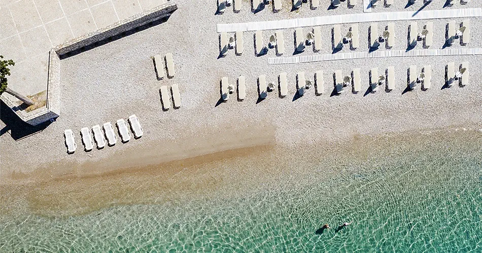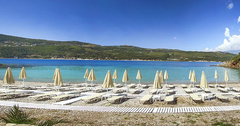 - Publiczna, żwirowa, bezpośrednio przy hotelu - Przejście przez drogę dojazdową do hotelu - Oddzielona lokalną drogą - Łagodne wejście do morza - Leżaki i parasole w wyznaczonej przez hotel strefie - bezpłatne (poza wyznaczoną strefą serwis plażowy płatny) - Ręcznik - płatne - Prysznice - Beach bar - płatny (istnieje możliwość korzystania z baru przy basenie - all inclusive bezpłatnie)