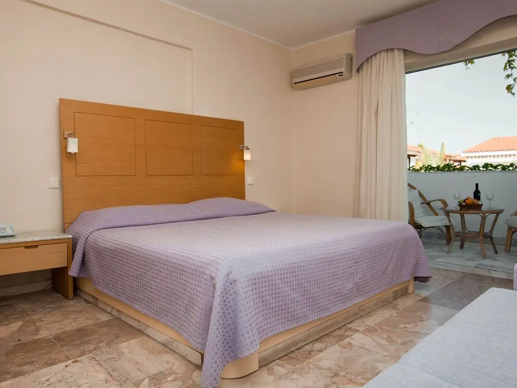 na Półwyspie Kassandra, od 500 m. od centrum niewielkiego kurortu Hanioti. W pobliżu hotelu restauracje, sklepy, bary. Przystanek autobusowy oddalony o ok. 200 m. Port lotniczy w Salonikach oddalony o ok. 90 km.