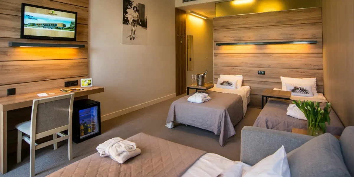 BoniFaCio SPA & Sport Resort to nowoczesny hotel harmonijnie wkomponowany w malownicze otoczenie łąk i lasów. Rozległe przeszklone powierzchnie pozwalają gościom cieszyć się pięknymi widokami natury, a bogata infrastruktura sportowa oraz zaplecze wellness zapewniają idealne warunki zarówno do relaksu, jak i aktywnego wypoczynku. Udogodnienia: Basen kryty, Jacuzzi, SPA, Sauna, Masaże, Wellness, Zabiegi odnowy biologicznej, Bar / restauracja, Ogród / Park, Plac zabaw dla dzieci, Boisko sportowe, Kort tenisowy, Sala sportowa, Siłownia, Salka fitness, Sporty wodne, Klimatyzacja, Pobyt z pupilem, Winda, Dla niepełnosprawnych, Parking, Płatność kartą