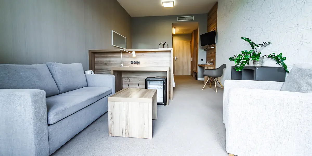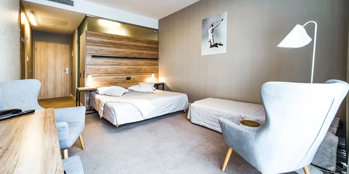 Komfortowy pokój (27 m2) z balkonem i dodatkową częścią wypoczynkową. W wyposażeniu: klimatyzacja, rozkładana sofa, fotel, TV LCD, chłodziarka, wifi, biurko, szlafroki, kapcie, ręcznik kąpielowy oraz prywatna łazienka z wanną lub kabina prysznicową.