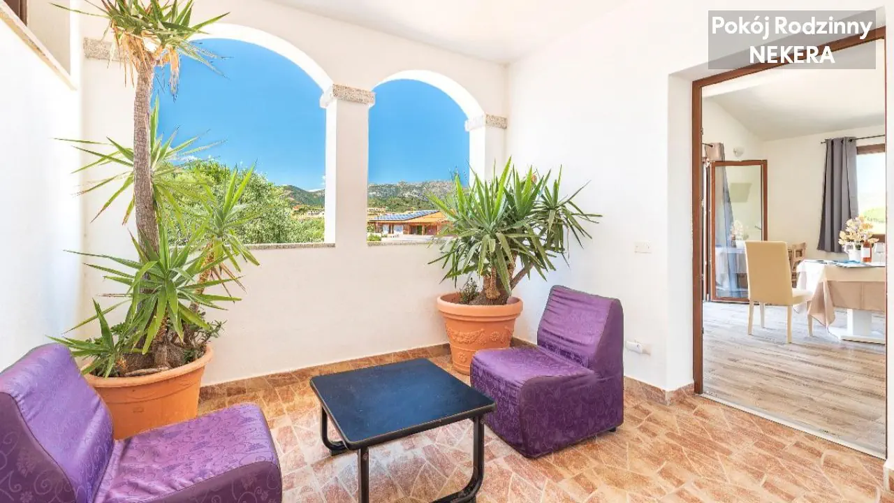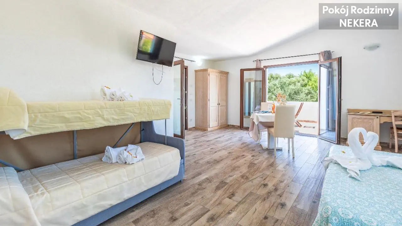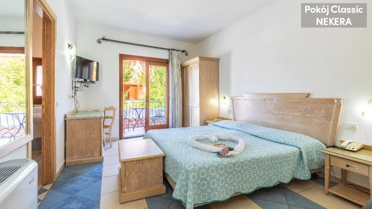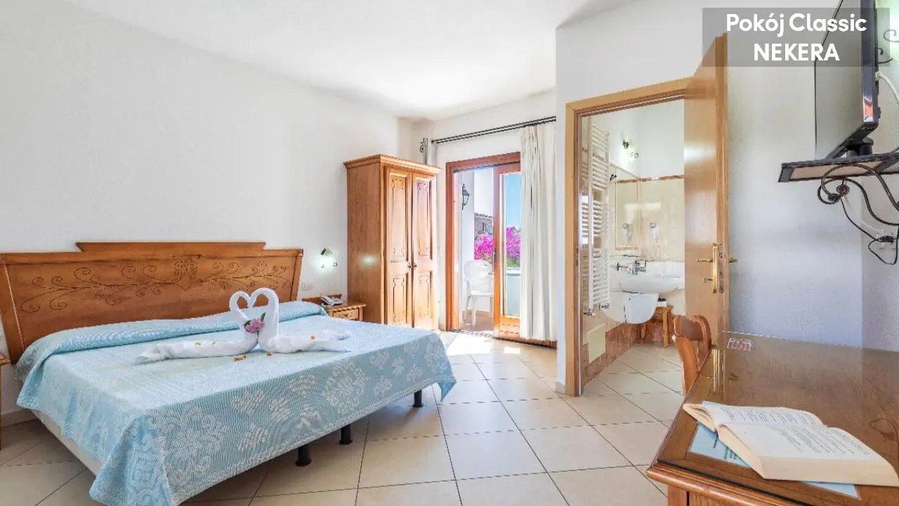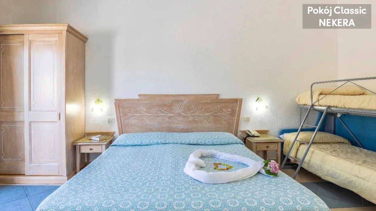 Pokój Dwuosobowy Standard: dla 2 osób dorosłych, łóżko podwójne lub 2 łózka pojedyncze, klimatyzacja, TV-Sat., minibar, sejf, telefon, prywatna łazienka (prysznic/wanna , toaleta, suszarka do włosów, zestaw mini kosmetyków), balkon lub patio. Pokój Classic: dla maks. 4 osób dorosłych, łóżko podwójne lub 2 łóżka pojedyncze oraz łózko piętrowe, poza tym wyposażony jak pokój Standard.