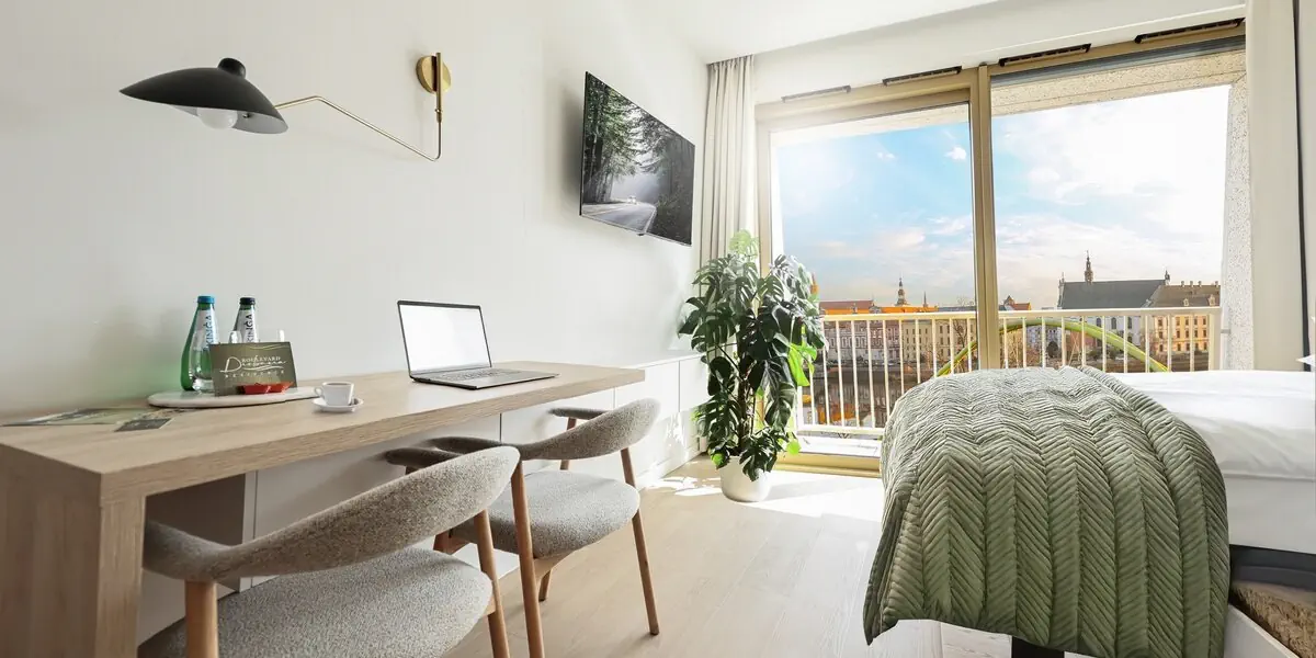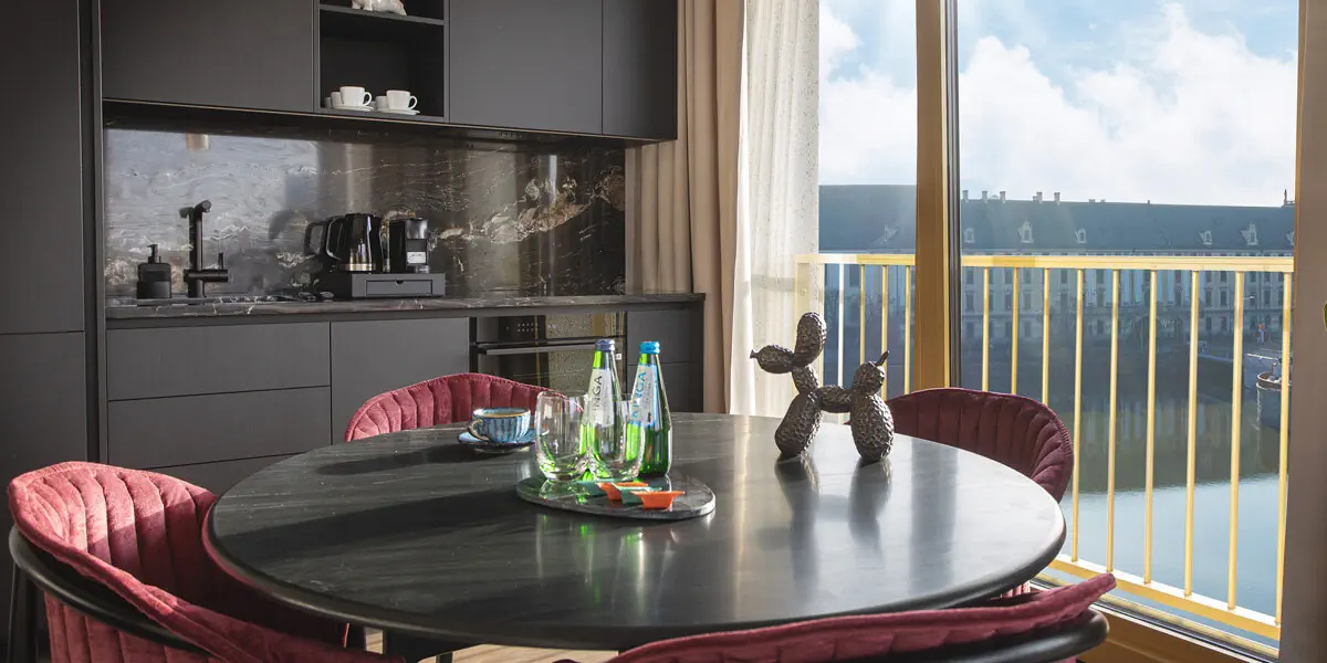 Studio z widokiem na Odrę. Ma wyposażony aneks kuchenny, kącik jadalniany, łazienkę oraz panoramiczne okna z widokiem na Odrę i wyspę Słodową.Nocleg na łóżku małżeńskim king size typu Murphy (łóżko składane do ściany). W łazience pralka, prysznic, kosmetyki, w kuchni lodówka, zmywarka do naczyń, ekspres do kawy, płyta indukcyjna, czajnik, naczynia i sztućce
