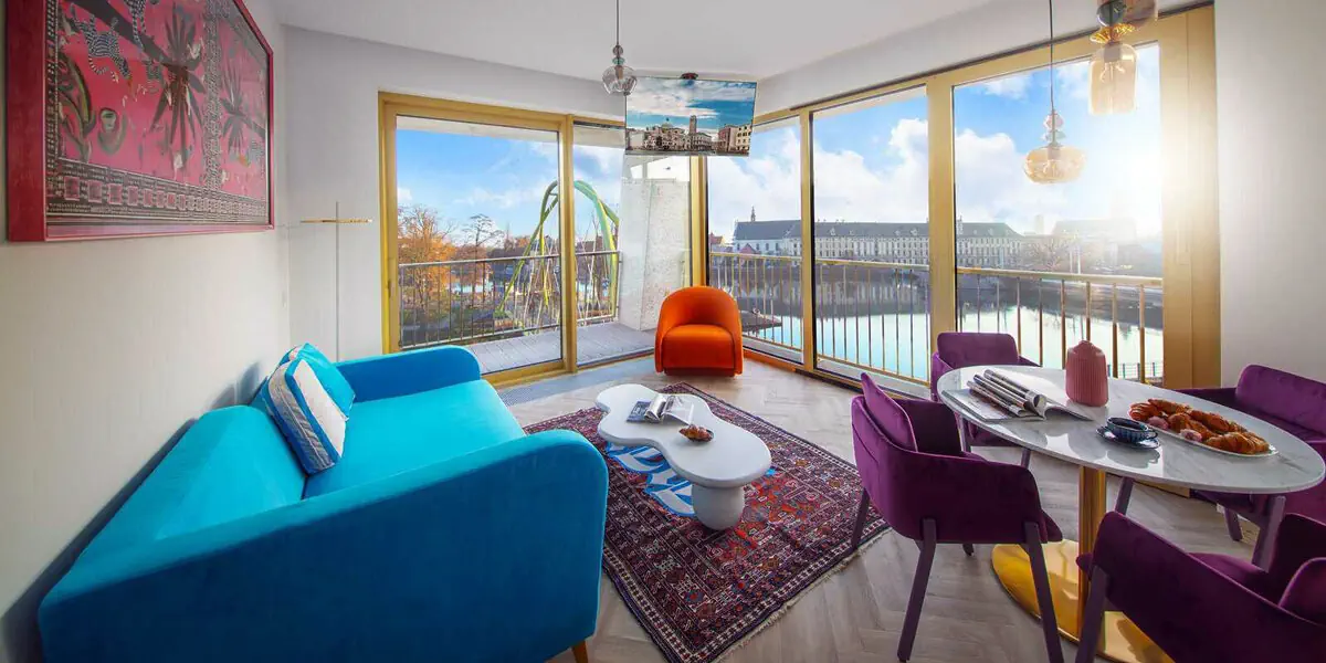 Luksusowy apartament z panoramicznym widokiem na Odrę i balkonem, który zapewnia dodatkową przestrzeń na relaks. W apartamencie znajdują się dwa oddzielne pokoje: salon z aneksem kuchennym i sofą oraz sypialnia z łóżkiem typu king-size. W łazience pralka, prysznic, kosmetyki, w kuchni lodówka, zmywarka do naczyń, ekspres do kawy, płyta indukcyjna, czajnik, naczynia i sztućce