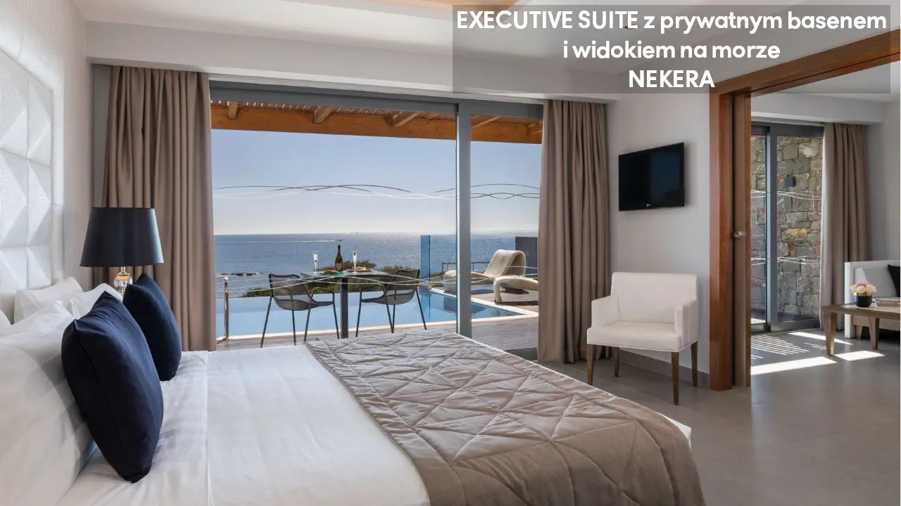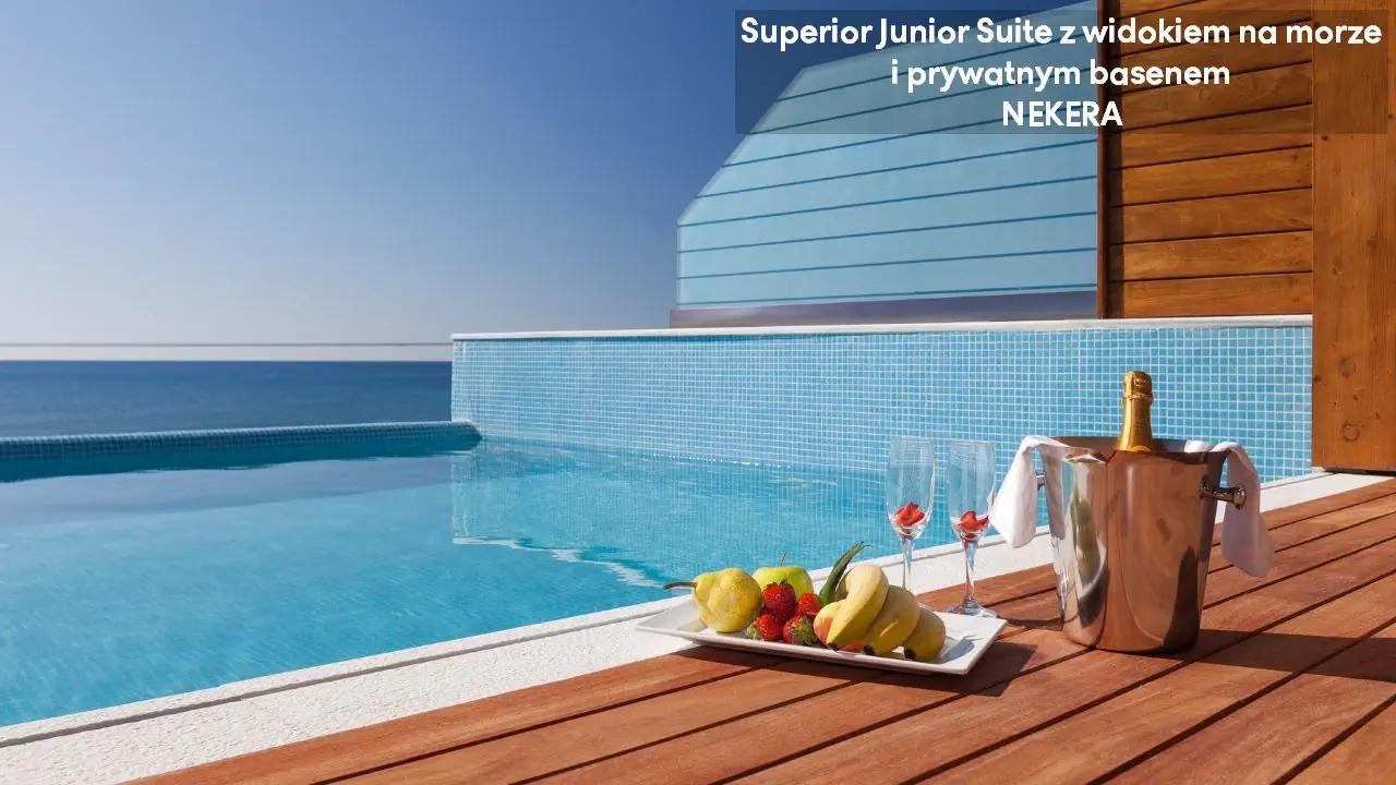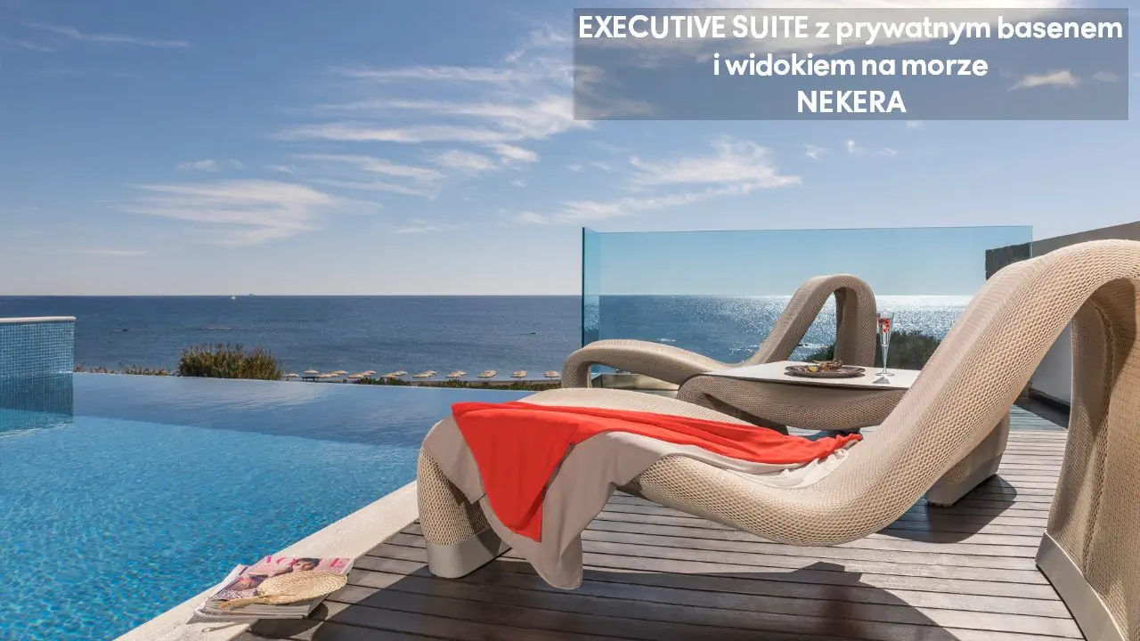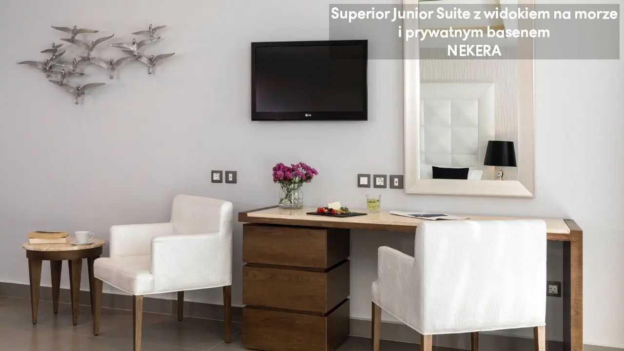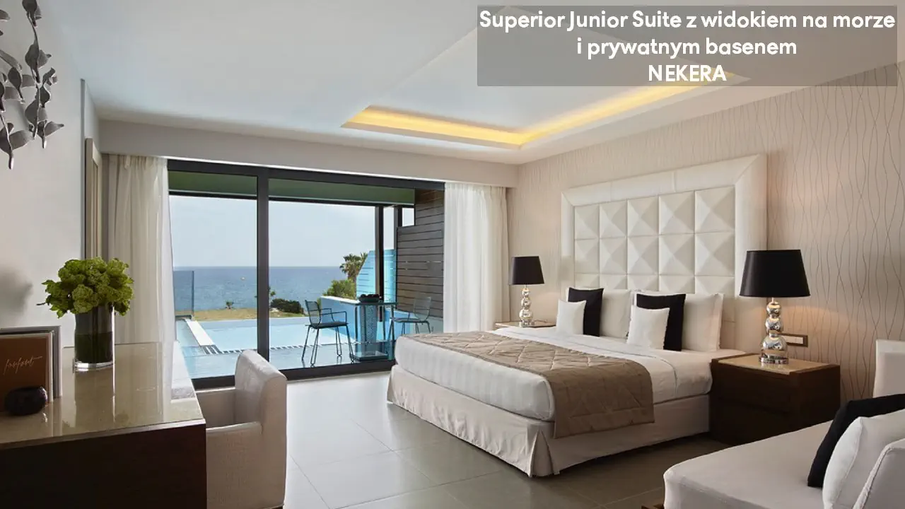 Pokój dwuosobowy Superior Deluxe z widokiem na morze - powierzchnia 31 m² - max 3-os. - łóżko podwójne - sofa lub łóżko rozkładane - klimatyzacja - bezpłatne Wi-Fi - telewizor z płaskim ekranem - telefon - mini bar (płatny) - zestaw do parzenia kawy/herbaty - ekspres do kawy Nespresso - sejf - żelazko i deska do prasowania - łazienka z prysznicem i wanną - suszarka do włosów - zestaw mini kosmetyków - kapcie, szlafrok - balkon lub taras z widokiem na morze Junior Suite z prywatnym basenem i częściowym widokiem na morze - powierzchnia 30 m² - max 2-os. - łóżko podwójne - sofa lub łóżko rozkładane - klimatyzacja - bezpłatne Wi-Fi - telewizor z płaskim ekranem - telefon - mini bar (płatny) - zestaw do parzenia kawy/herbaty - ekspres do kawy Nespresso - sejf - żelazko i deska do prasowania - łazienka z prysznicem i wanną - suszarka do włosów - zestaw mini kosmetyków - kapcie, szlafrok - taras prywatnym basenem Superior Junior Suite z prywatnym basenem i częściowym widokiem na morze - powierzchnia 37 m² - max 3-os. - łóżko podwójne - sofa - klimatyzacja - bezpłatne Wi-Fi - telewizor z płaskim ekranem - telefon - mini bar (płatny) - zestaw do parzenia kawy/herbaty - ekspres do kawy Nespresso - sejf - żelazko i deska do prasowania - łazienka z prysznicem i wanną - suszarka do włosów - zestaw mini kosmetyków - kapcie, szlafrok - taras prywatnym basenem Superior Junior Suite z prywatnym basenem i widokiem na morze - powierzchnia 37 m² - max 3-os. - łóżko podwójne - sofa - klimatyzacja - bezpłatne Wi-Fi - telewizor z płaskim ekranem - telefon - mini bar (płatny) - zestaw do parzenia kawy/herbaty - ekspres do kawy Nespresso - sejf - żelazko i deska do prasowania - łazienka z prysznicem i wanną - suszarka do włosów - zestaw mini kosmetyków - kapcie, szlafrok - taras prywatnym basenem Mediterranean Suite z prywatnym basenem i widokiem na morze - powierzchnia 44 m² - max 2-os. - łóżko podwójne - klimatyzacja - bezpłatne Wi-Fi - telewizor z płaskim ekranem - telefon - mini bar (płatny) - zestaw do parzenia kawy/herbaty - ekspres do kawy Nespresso - sejf - żelazko i deska do prasowania - łazienka z prysznicem i wanną z jacuzzi - suszarka do włosów - zestaw mini kosmetyków - kapcie, szlafrok - taras prywatnym basenem Executive Suite z prywatnym basenem i widokiem na morze - powierzchnia 60 m² - max 4-os. - salon i sypialnia - drzwi przesuwne - łóżko podwójne - podwójna sofa - klimatyzacja - bezpłatne Wi-Fi - 2 telewizory z płaskim ekranem - telefon - mini bar (płatny) - zestaw do parzenia kawy/herbaty - ekspres do kawy Nespresso - sejf - żelazko i deska do prasowania - łazienka z prysznicem i wanną z jacuzzi - suszarka do włosów - zestaw mini kosmetyków - kapcie, szlafrok - taras prywatnym basenem