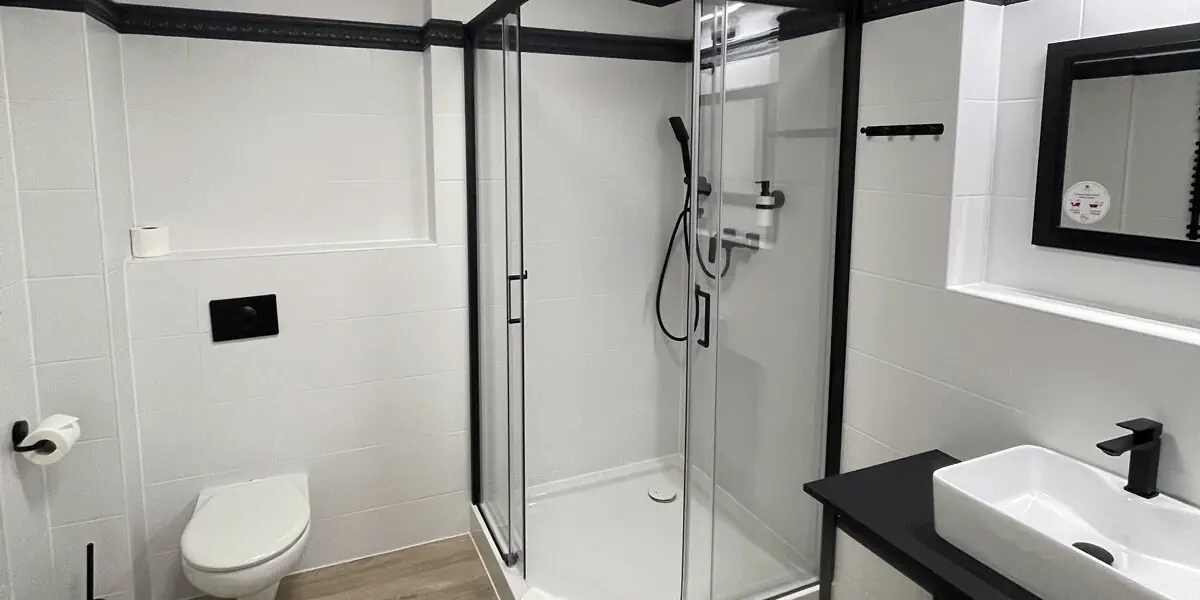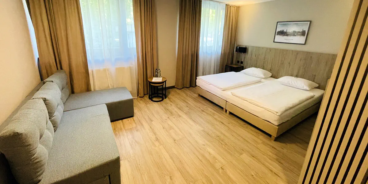 Komfortowy pokój wyposażony w: telewizor, bezprzewodowy internet WiFi, zestaw do parzenia kawy i herbaty, czajnik elektryczny oraz prywatną łazienkę z kabiną prysznicową i suszarką do włosów.