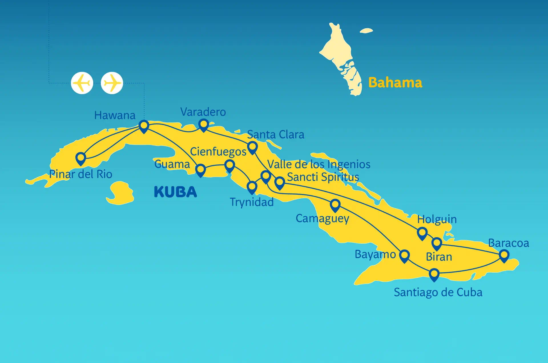 Do dyspozycji gości Część objazdowa: w hotelu bar, restauracja, niekiedy basen. Wyżywienie Część objazdowa: śniadania i obiadokolacje (zazwyczaj w formie bufetu) poza noclegiem w Camaguey (w Camaguey tylko śniadanie, kolacja dodatkowo płatna). Część pobytowa w Varadero: All Inlcusive. Zakwaterowanie Część objazdowa Hotele *** kategorii lokalnej - (11 rozpoczętych dób hotelowych). Pokoje: 2 - osobowe z łazienką, skromne. Wyżywienie: śniadania i obiadokolacje (zazwyczaj w formie bufetu) poza noclegiem w Camaguey (w Camaguey tylko śniadanie, kolacja dodatkowo płatna). Część pobytowa Hotele w Varadero - (3 rozpoczęte doby hotelowe). Opisy dostępne w sekcji “Varadero - hotele”. Wyżywienie: All Inlcusive.