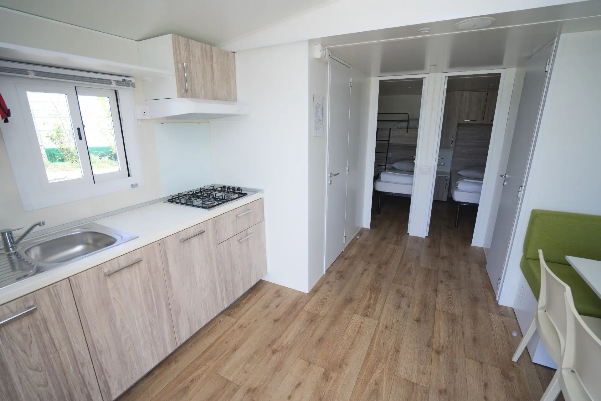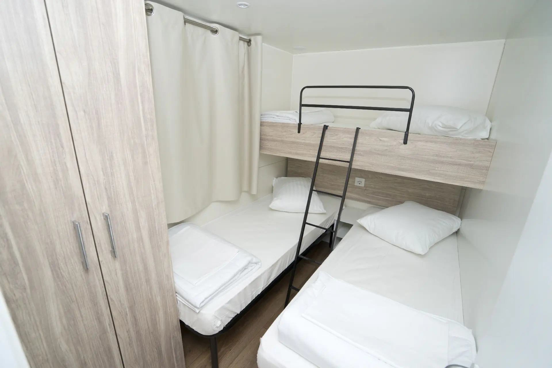 ok. 24 m2, klimatyzacja, internet WiFi (w cenie), aneks kuchenny z jadalnią, 2 sypialnie dla 2 osób - w tym jedna z łóżkiem piętrowym (pościel w cenie), łazienka/WC, taras (stolik, krzesła) / uwaga! ręczniki - we własnym zakresie / możliwość 2 dostawek - odpłatnie (na zapytanie): dostawkami są łóżko pojedyncze w sypialni dla dzieci i sofa w pokoju z aneksem kuchennym.
