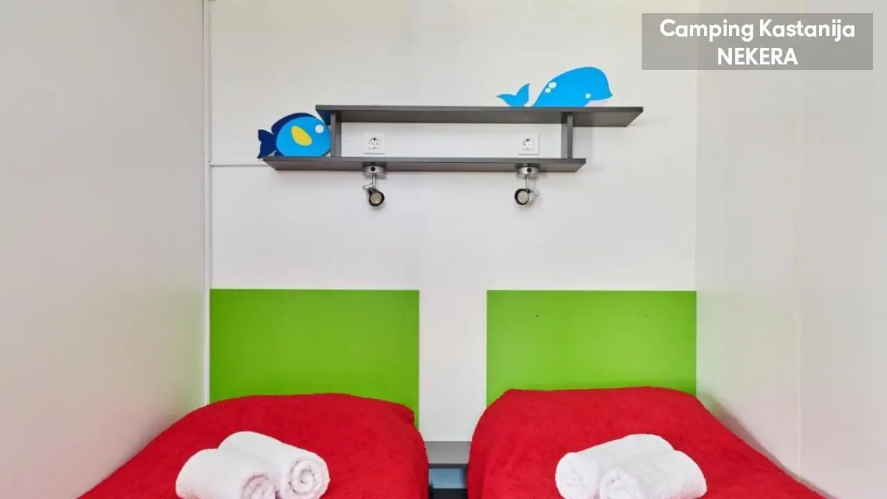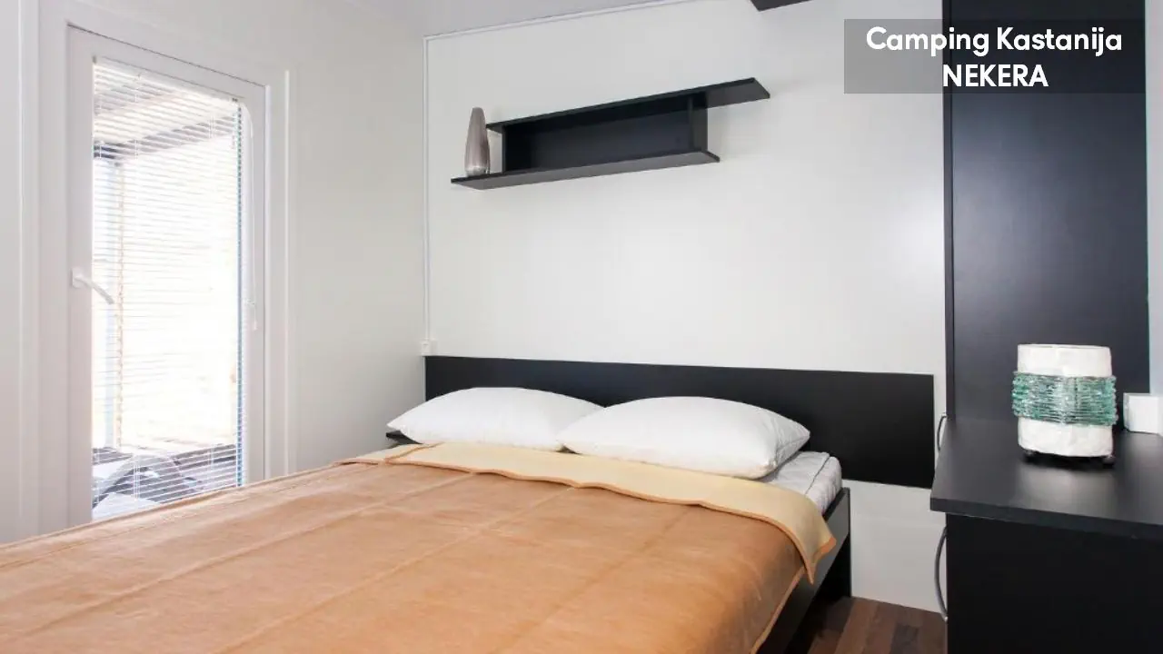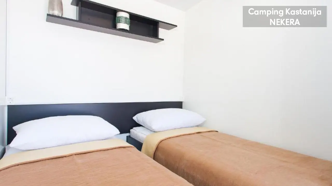 sypialnia z podwójnym łóżkiem, sypialnia z 2 łóżkami pojedynczymi, 2 łazienki, pomieszczenie dzienno-sypialne z aneksem kuchennym i rozkładaną sofą dla 2 os. Wspólny basen na każde 8 domków mobilnych.