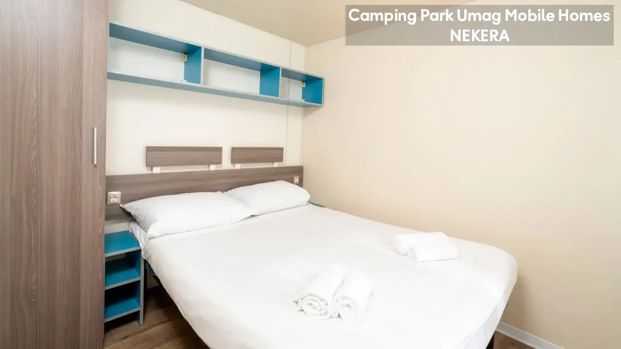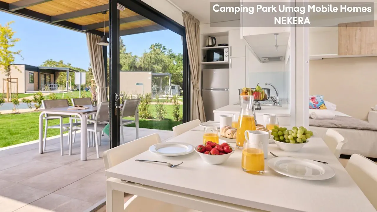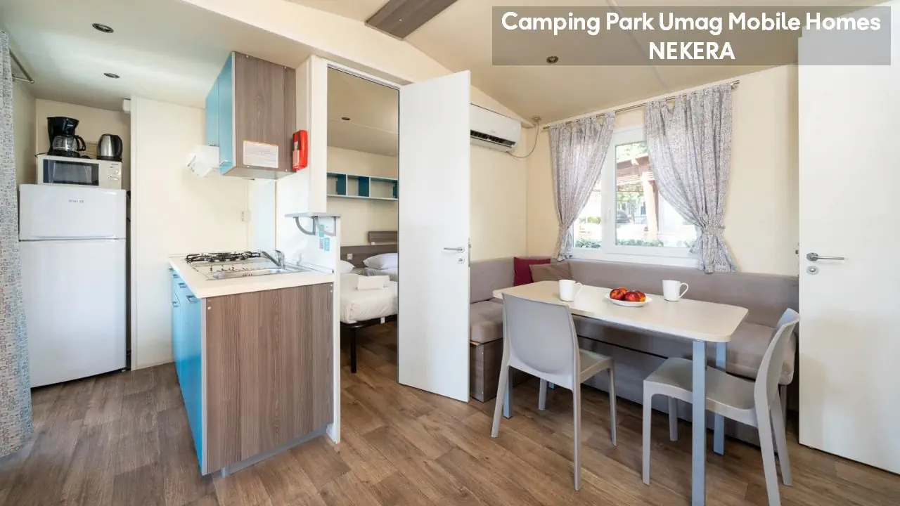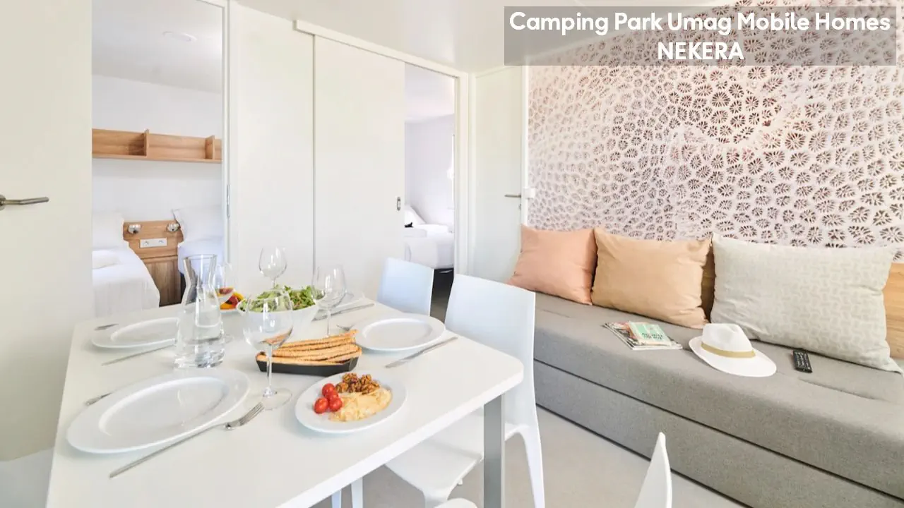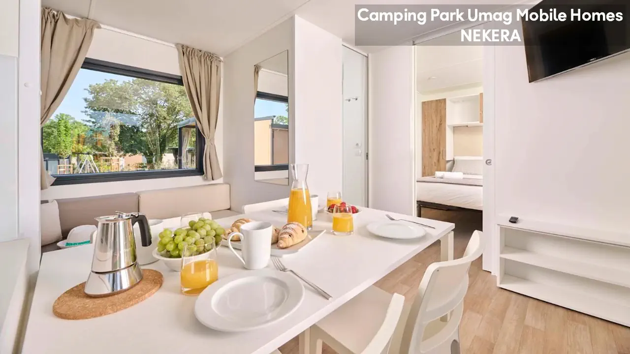 Classic Mobile Home: ok. 24 m², dla max 4 osób dorosłych, sypialnia z łóżkiem podwójnym, sypialnia dziecięcej z 2 łóżkami pojedynczymi, łazienki (prysznic, WC) oraz części dziennej z w pełni wyposażonym aneksem kuchennym (zestaw naczyń dla 6 osób, duża lodówka z zamrażalnikiem), klimatyzacja, TV-Sat., zadaszony, drewniany taras z meblami ogrodowymi (stół, krzesła, leżaki), niewielki ogródek oraz miejsce parkingowe w pobliżu. Pościel i ręczniki w cenie, wymiana pościeli i ręczników raz w tygodniu (dodatkowe wymiany dodatkowo płatne). Premium Plus Mobile Home: ok. 34 m² części mieszkalnej + ok. 25 m² zadaszonego tarasu, dla max 4 osób dorosłych, położony w nowej, odnowionej części domków mobilnych, w pobliżu odnowionych basenów współdzielonych (ok. 24 m², wspólne dla 5–7 domków). Składa się z sypialni z łóżkiem podwójnym, drugiej sypialni z 2 łóżkami pojedynczymi, salonu z rozkładaną sofą, 2 łazienek (każda z prysznicem i WC) oraz w pełni wyposażonej kuchni (komplet naczyń, duża lodówka z zamrażalnikiem, czajnik, kuchenka mikrofalowa). Na wyposażeniu: klimatyzacja, TV-Sat., część jadalna, szafa/garderoba, zadaszony taras z zestawem mebli ogrodowych (stół, krzesła), strefa Chill & Grill z grillem gazowym i blatem roboczym, miejsce parkingowe w pobliżu. Pościel w cenie (wymiana raz w tygodniu), ręczniki zmieniane co 3 dni (częstsza wymiana za opłatą).