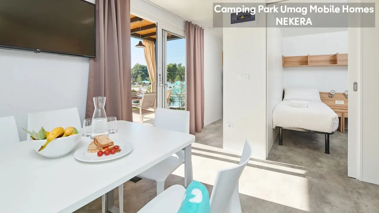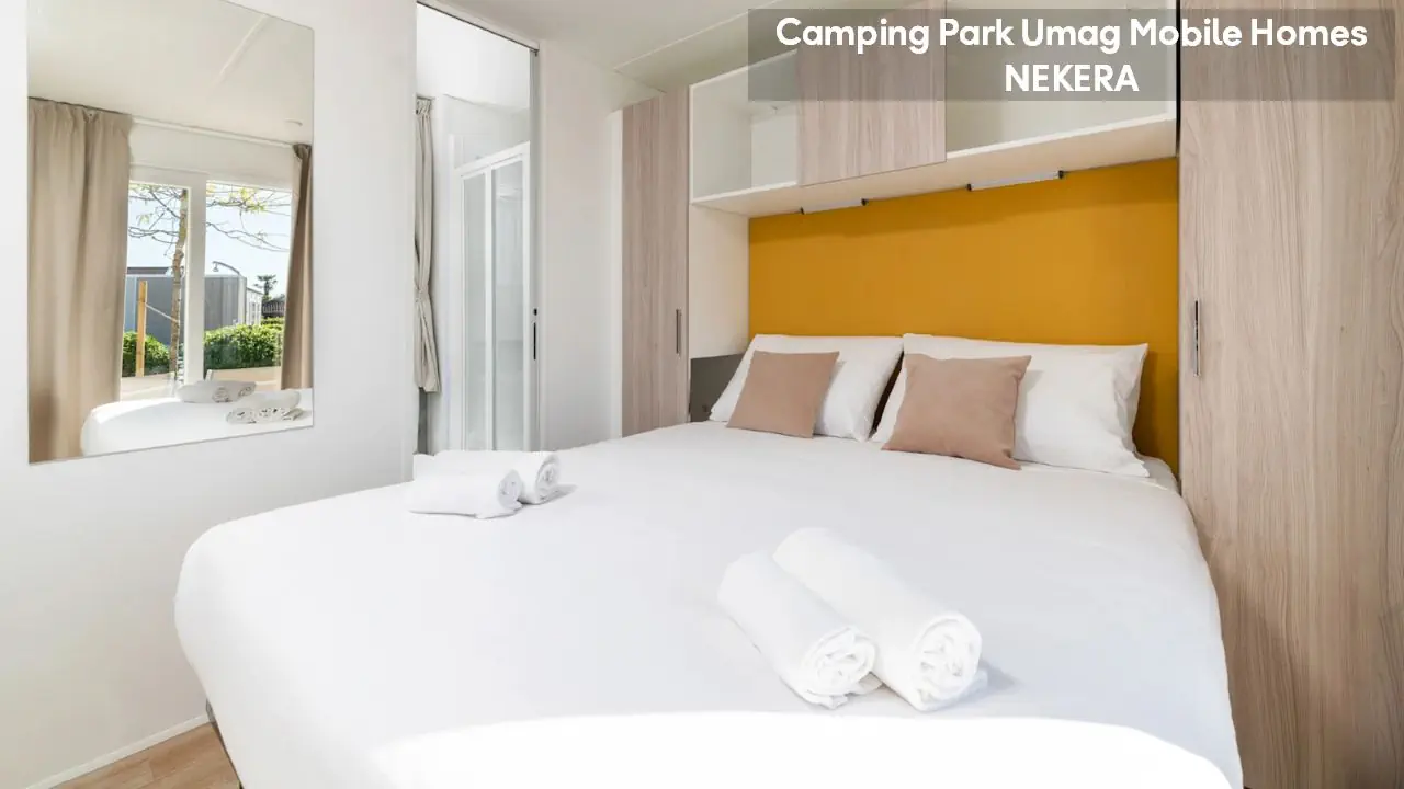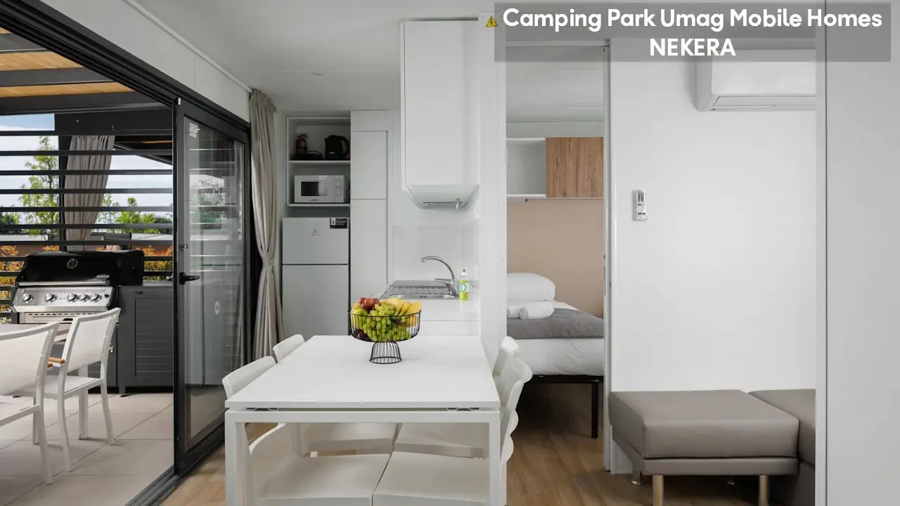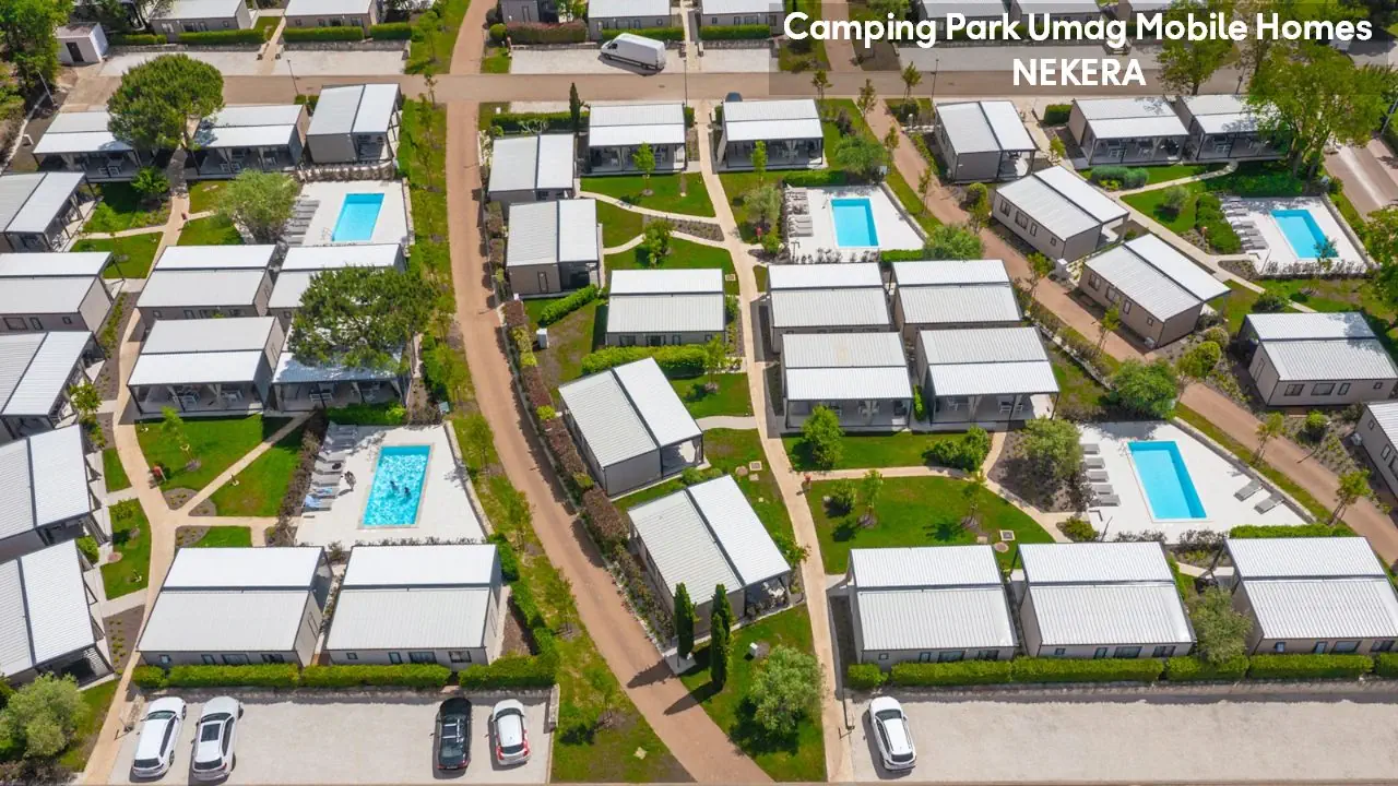 Classic Mobile Home: ok. 24 m², dla max 4 osób dorosłych, sypialnia z łóżkiem podwójnym, sypialnia dziecięcej z 2 łóżkami pojedynczymi, łazienki (prysznic, WC) oraz części dziennej z w pełni wyposażonym aneksem kuchennym (zestaw naczyń dla 6 osób, duża lodówka z zamrażalnikiem), klimatyzacja, TV-Sat., zadaszony, drewniany taras z meblami ogrodowymi (stół, krzesła, leżaki), niewielki ogródek oraz miejsce parkingowe w pobliżu. Pościel i ręczniki w cenie, wymiana pościeli i ręczników raz w tygodniu (dodatkowe wymiany dodatkowo płatne). Premium Plus Mobile Home: ok. 34 m² części mieszkalnej + ok. 25 m² zadaszonego tarasu, dla max 4 osób dorosłych, położony w nowej, odnowionej części domków mobilnych, w pobliżu odnowionych basenów współdzielonych (ok. 24 m², wspólne dla 5–7 domków). Składa się z sypialni z łóżkiem podwójnym, drugiej sypialni z 2 łóżkami pojedynczymi, salonu z rozkładaną sofą, 2 łazienek (każda z prysznicem i WC) oraz w pełni wyposażonej kuchni (komplet naczyń, duża lodówka z zamrażalnikiem, czajnik, kuchenka mikrofalowa). Na wyposażeniu: klimatyzacja, TV-Sat., część jadalna, szafa/garderoba, zadaszony taras z zestawem mebli ogrodowych (stół, krzesła), strefa Chill & Grill z grillem gazowym i blatem roboczym, miejsce parkingowe w pobliżu. Pościel w cenie (wymiana raz w tygodniu), ręczniki zmieniane co 3 dni (częstsza wymiana za opłatą).
