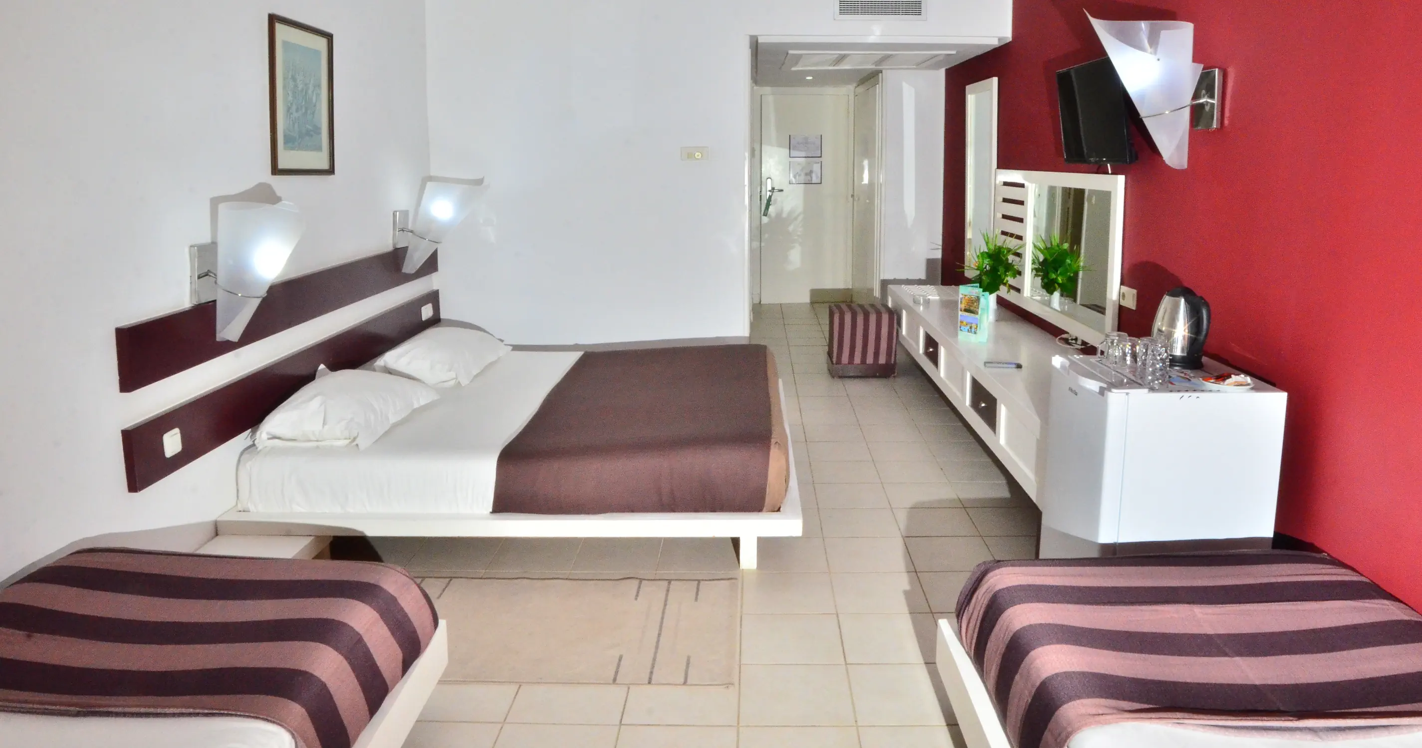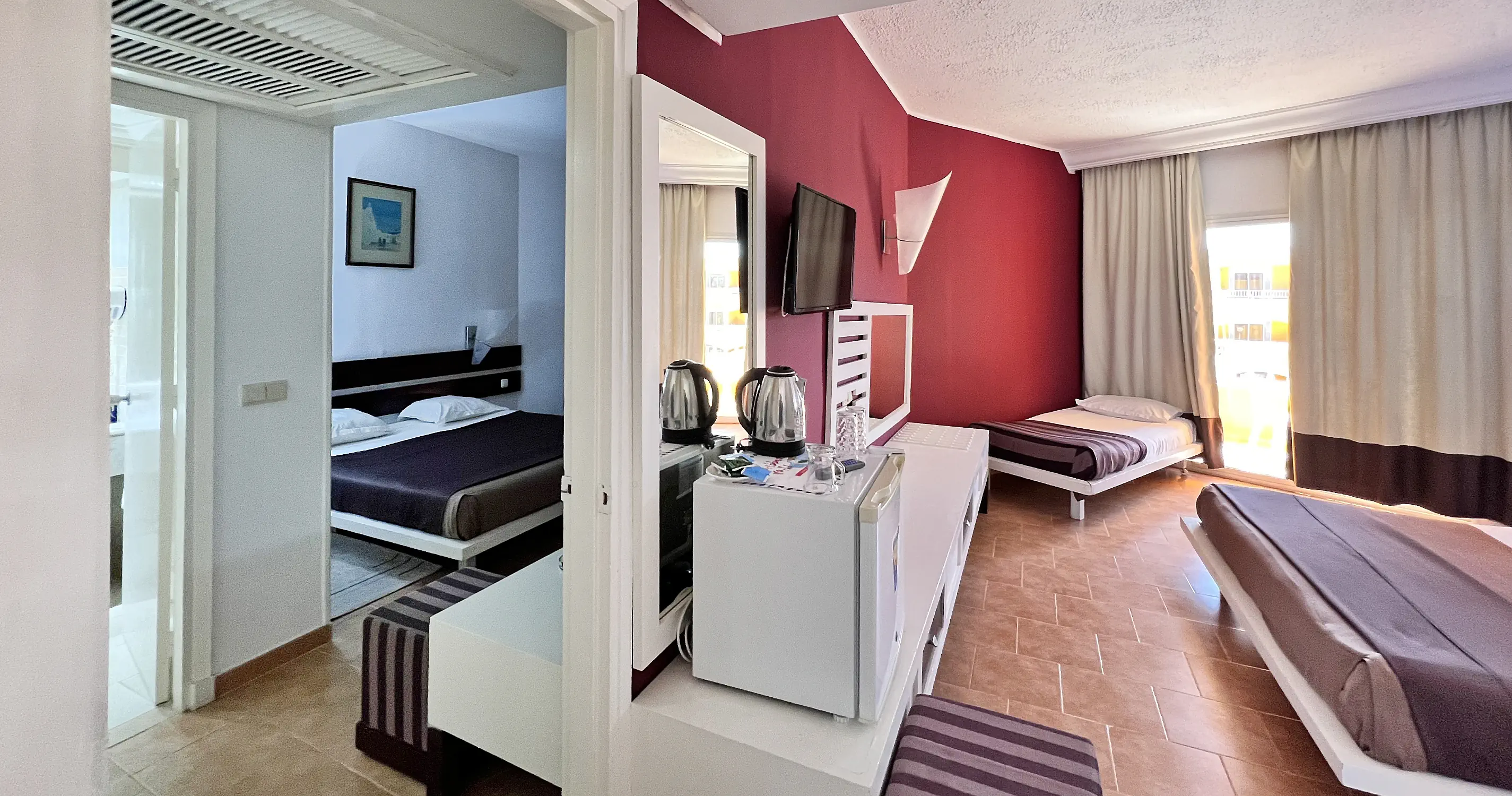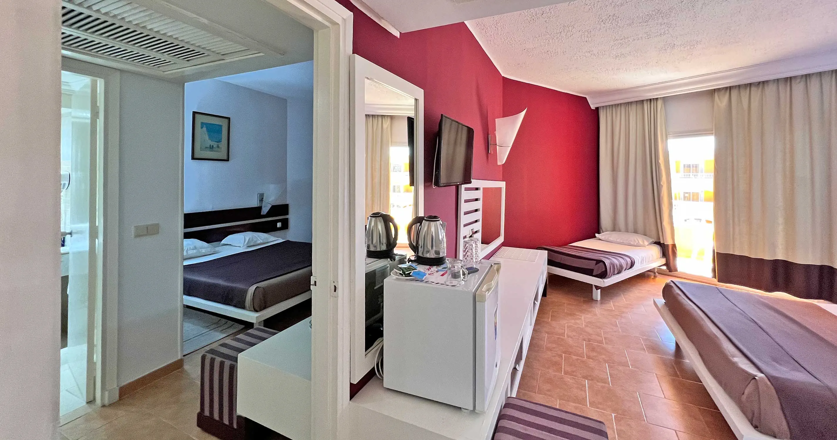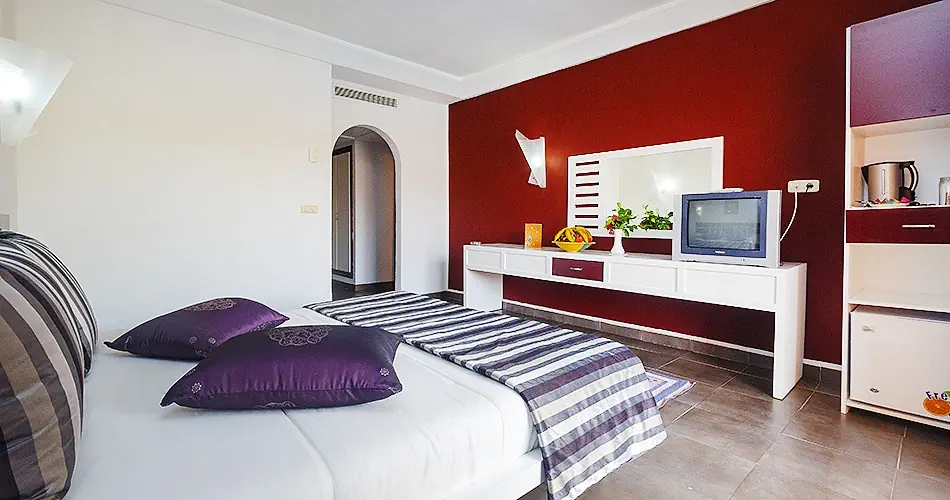 Pokój Standard Klimatyzacja (15.06-15.09) Łazienka z prysznicem lub wanną, toaleta, suszarka do włosów TV-Sat Telefon Minibar (bezpłatny: woda uzupełniana codziennie, napoje tylko na przyjazd gości, w kolejnych dniach płatne dodatkowo) Sejf - płatny (ok. 15 EUR/tydzień) Łóżeczko dziecięce na życzenie bezpłatnie Balkon lub taras Pokój Standard czteroosobowy - jedno pomieszczenie Pokój Family Wyposażenie jak w pokoju Standard 2 sypialnie oddzielone drzwiami, 1 łazienka