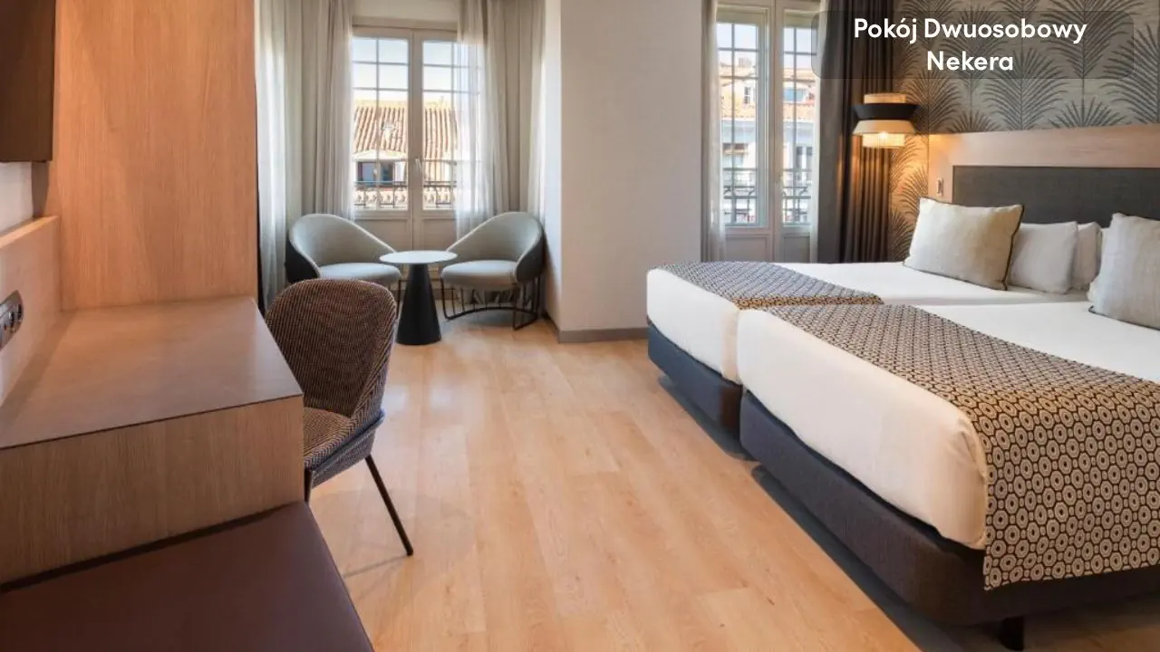 Pokój dwuosobowy (Double Room) ok. 15m², jedno łóżko podwójne lub dwa pojedyncze, jasna, nowoczesna aranżacja, drewniana podłoga, klimatyzacja, minibar, sejf, telewizor, łazienka z prysznicem lub wanną Pokój dwuosobowy z widokiem na ulicę Atocha (Double Room with Atocha View) ok. 20 m², dodatkowo dobrze wyciszony, balkon lub okno z widokiem na ulicę, wyposażenie jak w pokoju dwuosobowym Pokój dwuosobowy z tarasem (Terrace Room) ok. 24m², jedno łóżko king-size, taras z meblami ogrodowymi i widokiem na Atocha, Smart TV, zestaw do kawy i herbaty, minibar, sejf. Pokój typu Superior ok. 31 m², sypialnia z aneksem wypoczynkowym,klimatyzacja, Smart TV, ekspres Nespresso, sejf, czasem balkon, wyposażenie wyższego standardu. Pokój typu Superior z tarasem (Superior Terrace Room) ok. 30 m² z osobnym salonem, taras z widokiem, wanną, ekspres Nespresso, albatrosy i kapcie w standardzie, VIP-amenities, Smart TV. Pokój trzyosobowy (Triple Room) ok. 15m², dwa łóżka pojedyncze i sofa rozkładana, jasny i nowoczesny wystrój, Smart TV, łazienka z prysznicem lub wanną. Pokój rodzinny (Family Room) ok. 20m², dwa łóżka pojedyncze plus łóżko piętrowe, minibar, sejf, Smart TV, elegancki, przyjazny rodzinom styl. Rodzinny Deluxe (Family Deluxe) - ok.25m², z dodatkowymi udogodnieniami jak Smart TV, minibar, lepsze wykończenie, często widok na basen. Junior Suite ok. 54 m², wydzielona sypialnia i przestronny salon, unikatowe freski i sztukaterie z XIX wieku, podłoga z parkietu, wanna z hydromasażem, Smart TV, ekspres Nespresso, widok na Atocha. Junior Suite z prywatnym basenem na tarasie (Junior Suite with Private Pool) podobna powierzchnia co Junior Suite, plus taras (ok.24 m²) z małym basenem, ekskluzywne udogodnienia-ekspres Nespresso. Pokój jednoosobowy (Single Room) ok. 13m², łóżko pojedyncze, standardowe wyposażenie (minibar, sejf, Smart TV, biurko), wyciszony i funkcjonalny.