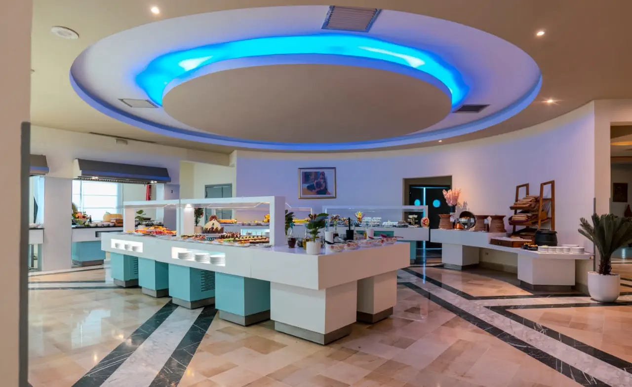 Śniadanie (06:00 - 10:00) - Main Restaurant - Les Patios, stół szwedzki, Obiad (12:30 - 14:00) - Main Restaurant - Les Patios, stół szwedzki, Kolacja (19:00 - 21:00) - Main Restaurant - Les Patios, stół szwedzki, A La Carte Restaurant - Le Carre (19:00 - 21:30) (19:00 - 21:30), bez limitu, Kuchnia: Włoska, Wymagana rezerwacja: Tak ¹⁾, A La Carte Restaurant - La Rotonde (19:00 - 21:30) (19:00 - 21:30), raz podczas pobytu, Kuchnia: Tunezyjska, Wymagana rezerwacja: Tak, Blue Bar (10:00 - 18:00), Napoje: alkohole lokalne, napoje bezalkoholowe (10:00 - 18:00), My Way Bar (16:00 - 23:30), Napoje: alkohole lokalne, napoje bezalkoholowe (16:00 - 23:30), Beach club - Restaurant and Bar (10:00 - 18:00), Napoje: napoje bezalkoholowe (10:00 - 18:00), napoje bezalkoholowe, alkohole lokalne, lody ¹⁾ ¹⁾ - dodatkowo płatne